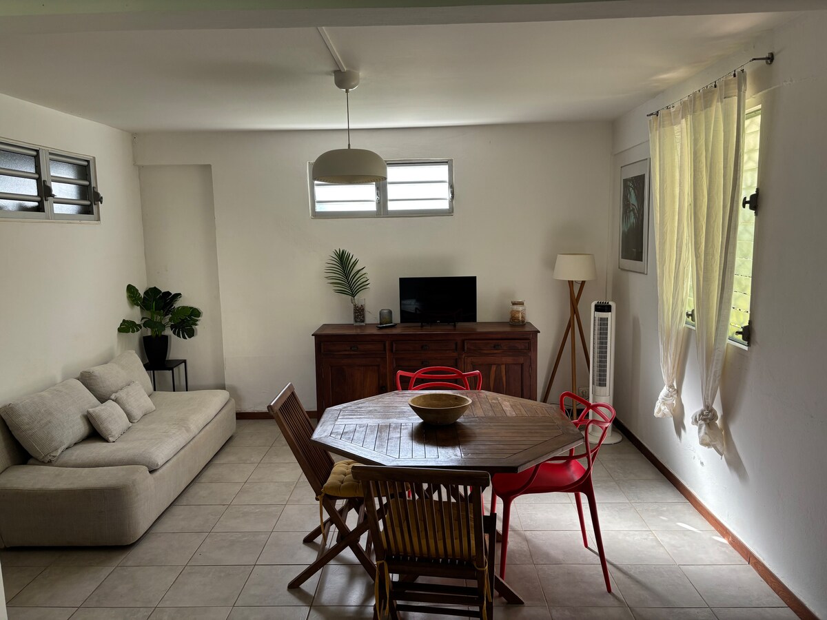 Agréable appartement en bas de villa : • Idéalement situé, à seulement 10 min de l’aéroport et des centres commerciaux. Sa position centrale est parfaite pour découvrir les plages du sud comme la nature luxuriante du nord. • Propre, spacieux et fonctionnel, avec une entrée indépendante pour plus d’intimité. • Grande terrasse avec jardin verdoyant, idéale pour se détendre et profiter du cadre tropical. Un point de départ parfait pour explorer toute la Martinique.