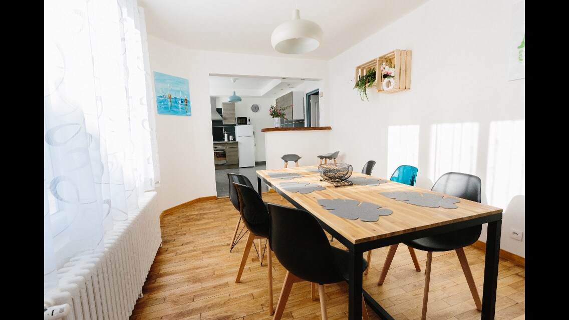 這座連棟房屋為全家提供了放鬆的住宿體驗。它位於靠近市中心的安靜區域,有免費且方便的停車位。房子已經過全面翻新,優先考慮舒適度、空間和低能耗(標籤 B)。它由 3 間臥室組成,其中一間位於一樓,另有兩間浴室,可容納 6 人。我親自設計的裝飾時尚、現代且色彩繽紛,並以書籍和一些樂高積木裝飾,因為我是樂高的粉絲 :)