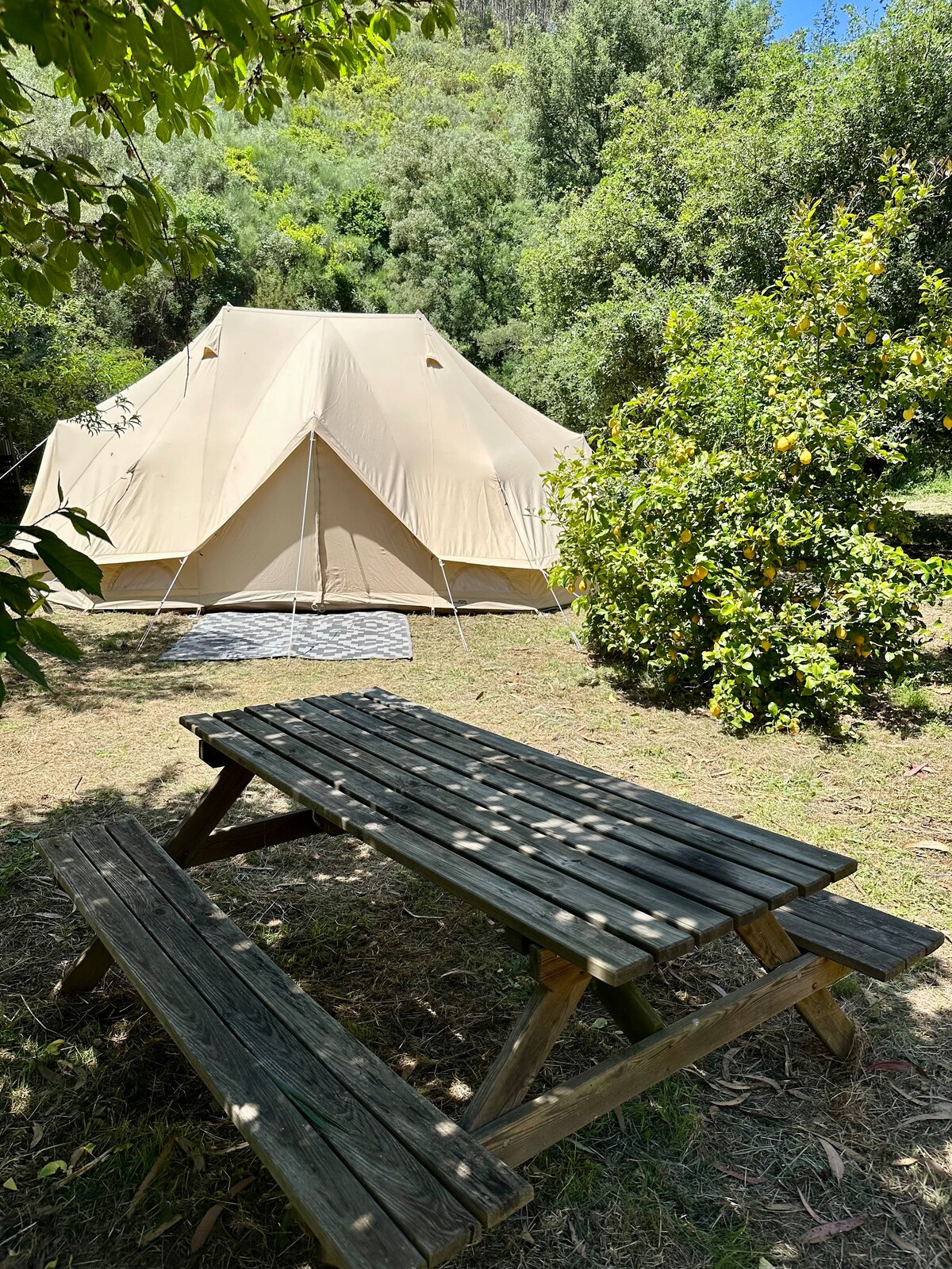 我們在遠離塵囂的農場出租非常寬敞的鐘形帳篷(30平方米)。 靠近Sardoal。靠近Tomar。 豪華舒適的戶外生活:豪華露營。 在美麗的大自然中放鬆身心的好地方。 鐘形帳篷和廚房有WiFi和電力。 室外廚房配有自來水、咖啡機、水壺和冰箱。 有多個放鬆、工作和用餐的地方。 屋外設有乾式廁所。 室外淋浴間有很好的熱水。 我們適合兒童和寵物入住:)