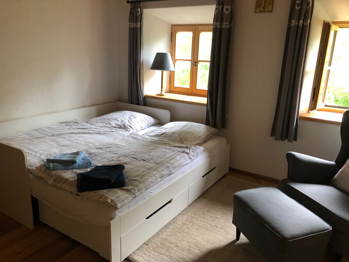 該工作室位於一座現代化農舍的二樓,地理位置極佳。 該物業位於基姆高 (Chiemgau) 北部阿爾卑斯山脈前最高山丘的山坡上。從院子裡可以看到東邊的土地和南邊的山脈。基姆湖 (Chiemsee) 距離約 25 公里,在市區有一個位置優美的游泳湖。 我們經營有機農業,包括養雞、養蜂、放養豬和小羊。