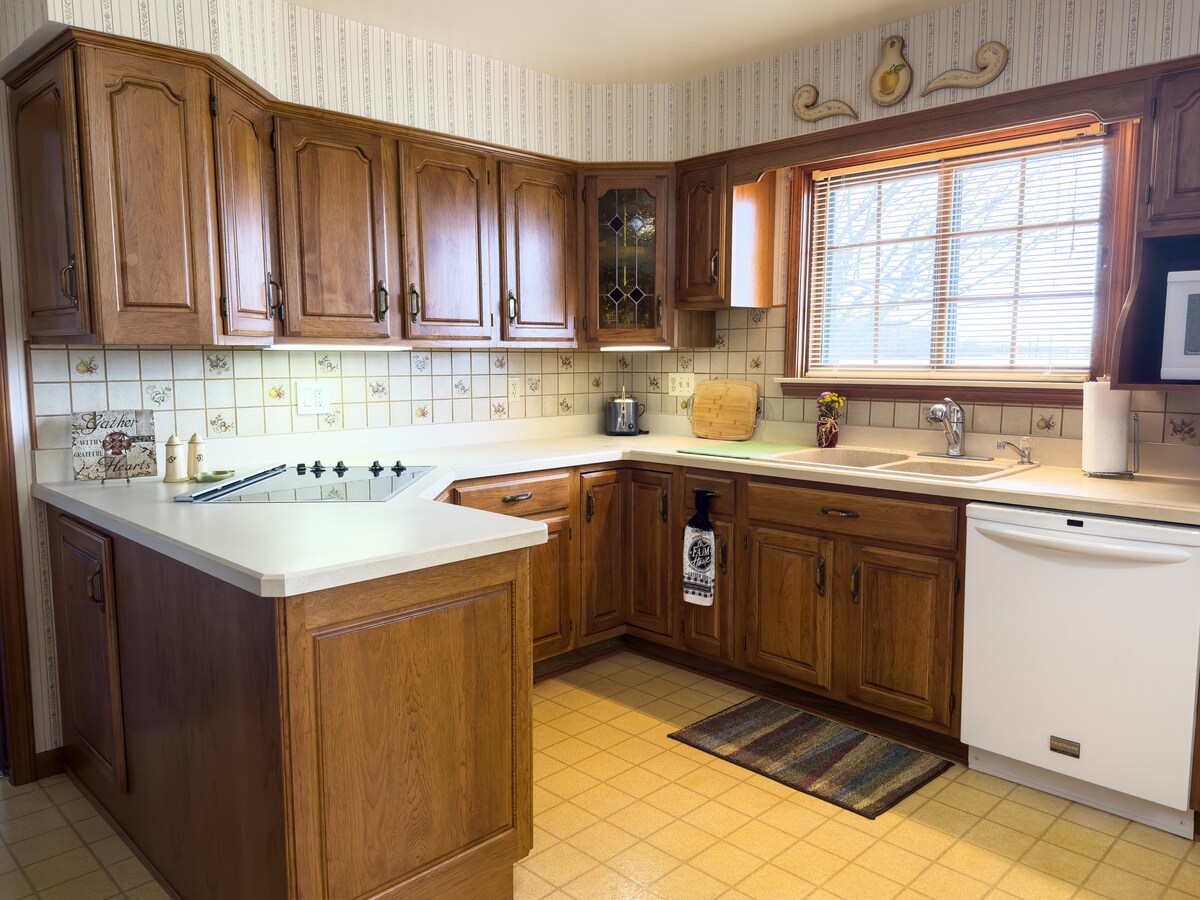 逃離我們寧靜的鄉村房源,舒適入住8. 這個寬敞的度假勝地坐落在農場和花園之間,讓您在醒來時欣賞令人驚嘆的日出,或在令人驚嘆的日落和360度地平線景觀中放鬆身心。 有空間放鬆身心、3間臥室、2間全功能浴室、設備齊全的廚房、客廳、餐廳、帶壁爐的家庭房、洗衣房、獨立辦公區和大院子,您的住宿保證真正的鄉村體驗。 我們為家庭而設。 不適合工作人員。