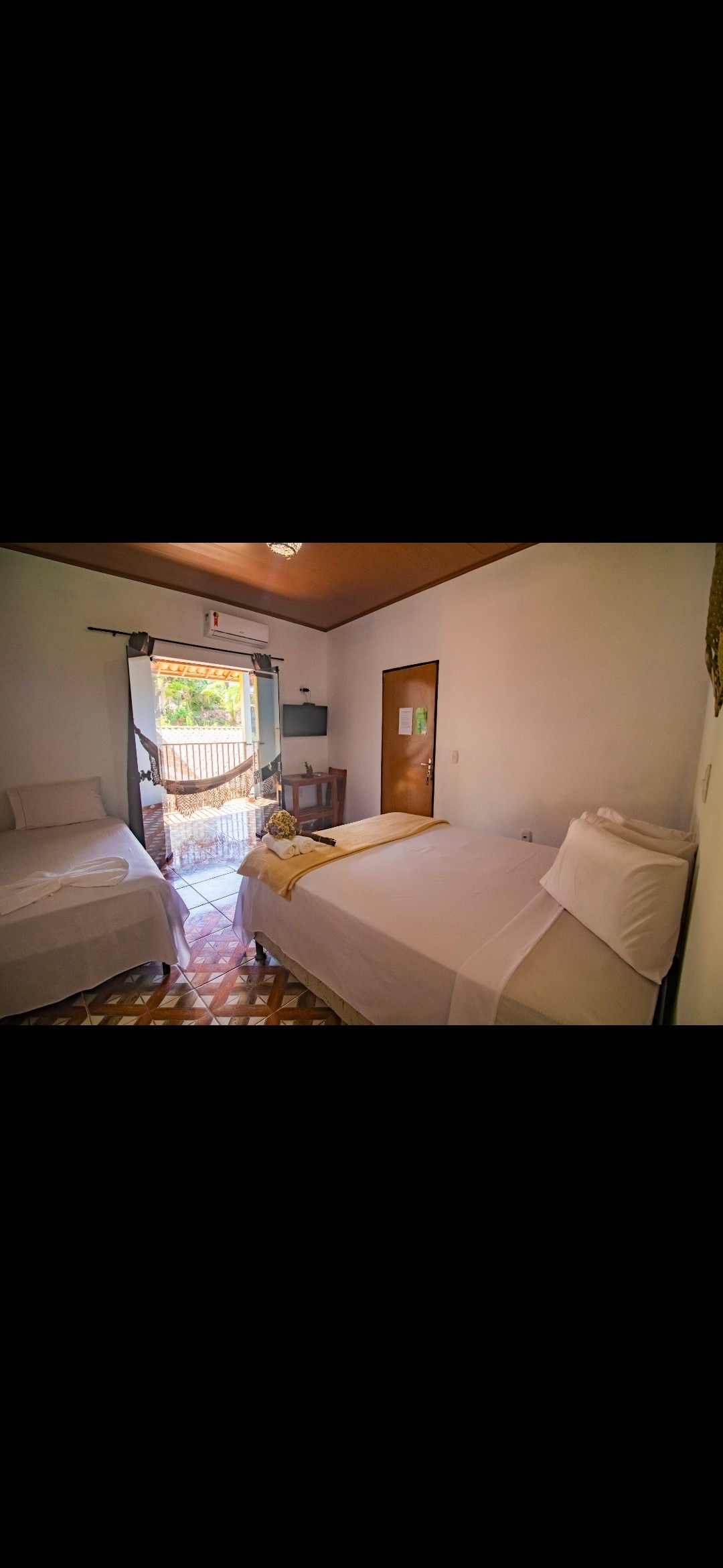 O quarto é equipado com uma cama de casal e uma cama de solteiro, banheiro privativo, além de TV, frigobar e ventilador. Para utilizar o ar condicionado, é acrescido R$20 na diária. Esse quarto pode ser equipado com cama de solteiro adicional, se necessário.