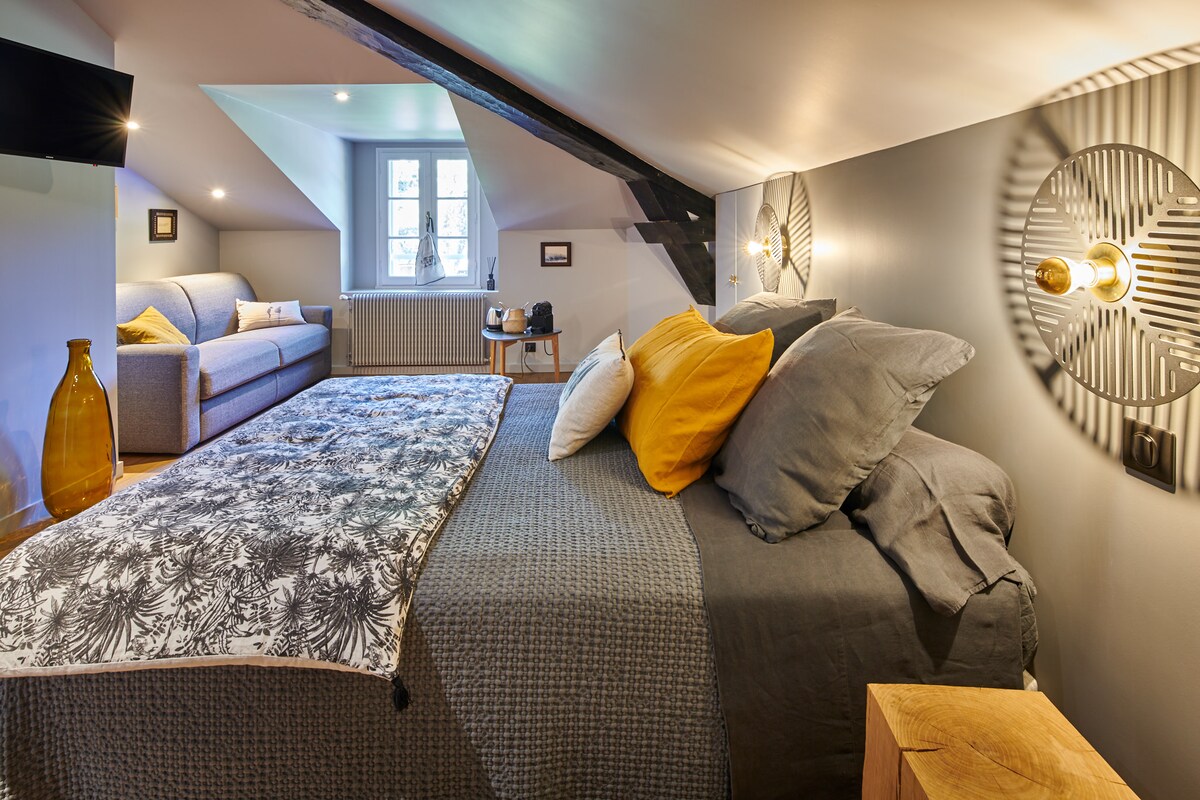 客房: 27 平方公尺的閣樓主套房,可容納 4 人,配有移動式空調,含早餐。 1 張床:180 特大號 1 張床:140 1 張嬰兒床(可應要求提供)。 浴室淋浴、廁所 +冰箱+微波爐+密碼保險箱。 ⚠️ 請注意,沒有廚房。 此套房 可容納 2、3 和 4 人。 從第 3 位房客起:每人額外收取 20 歐元。 (2 2歲以下嬰兒免費)。 距離巴約訥車站 5 公里。距離機場 16 公里 Biarritz.Espagne/30km 距離阿杜爾河畔的Vélodyssée自行車道400公尺。