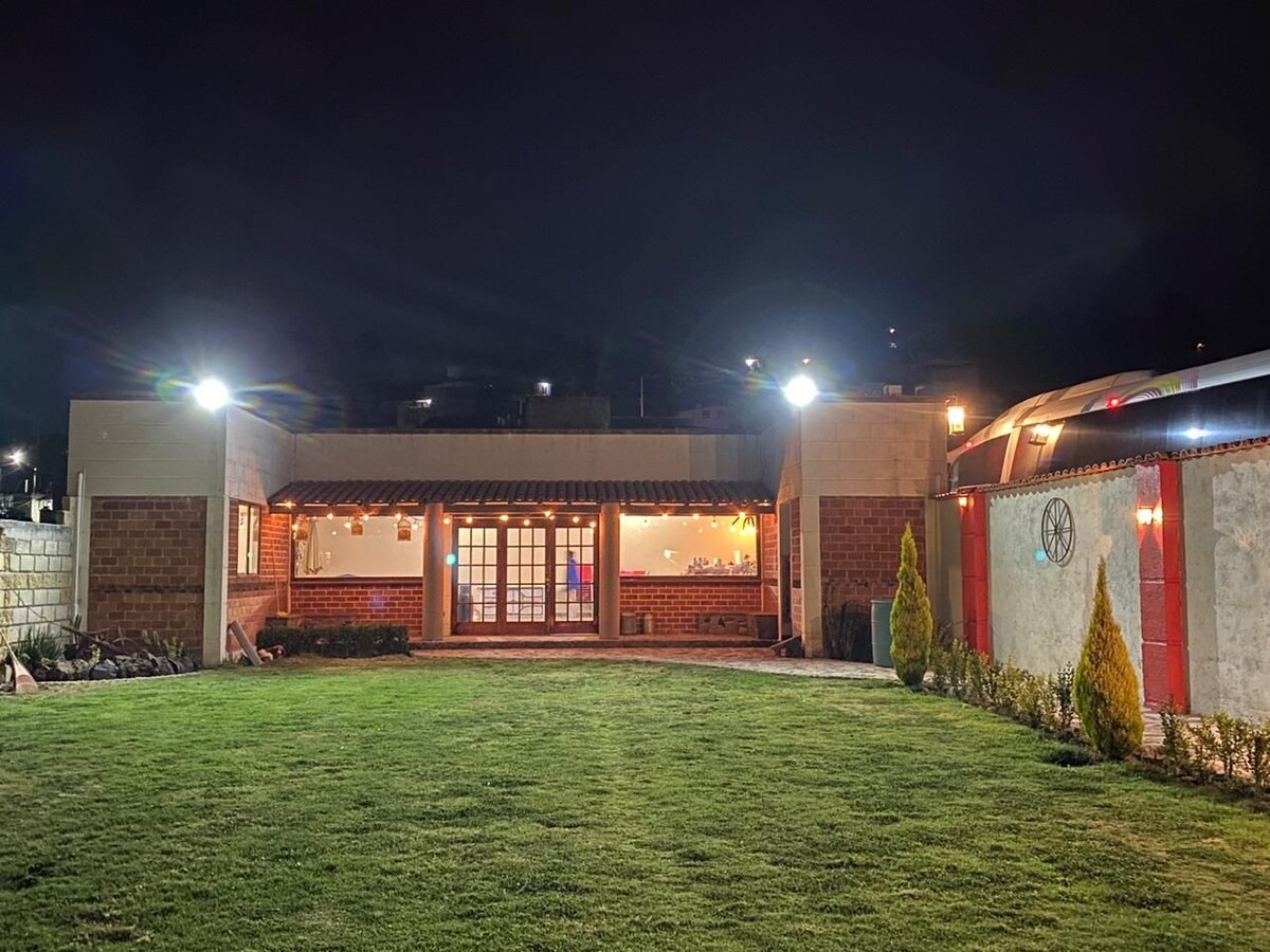 Un escape rápido para disfrutar con la familia o amigos muy cerca de la ciudad. Casa de campo espaciosa para 10 personas con muchas amenidades para disfrutar o descansar. 4 habitaciones con TV, 3 baños completos, 3 medios baño, estudio con sofá cama y pantalla de 90", chimenea, alberca con jacuzzi climatizada, sasador, jardín, red de volleyball, area para fogata, mini antro, billar, cancha de pádel,gimnasio, sonido ambiental, mesa de ping pong, WiFi. estacionamiento para 5 vehículos.