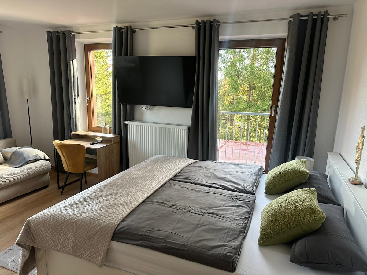 Unser kleiner SPATZ, 12 qm, im SCHITTLERHAUS ist klein aber fein, verfügt über ein Schlafzimmer mit Schreibtisch, Dusche ,WC und Waschtisch. Lassen Sie sich von den edlen Materialien überraschen! Unsere Jagdstube mit komplett ausgestatteter Küche, kann gerne mitbenutzt werden.