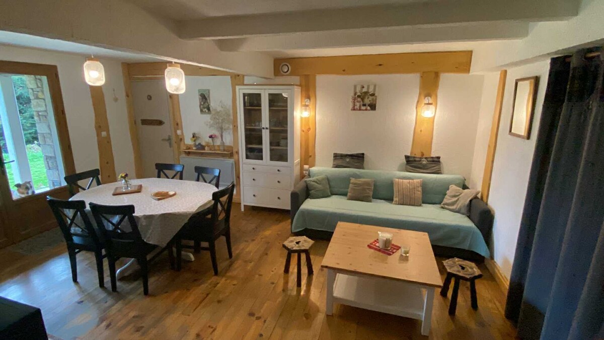 在這間安靜優雅的小屋中放鬆身心,小屋已經全面翻新,靠近穿梭巴士(150米)和山間步道(30米)。非常適合6人入住,由3個馬力和一個睡眠區組成。 DRC : 160 + 浴室 + 衛生間的1張床 160 +浴室的1張床 A L樓 屋頂下140的1張床 +2張床,尺寸為80 * 190 +浴室。 客廳配有1個生物乙醇壁爐(應要求提供),可欣賞森林和山景。 1個位於樹林邊緣的寧靜天堂。