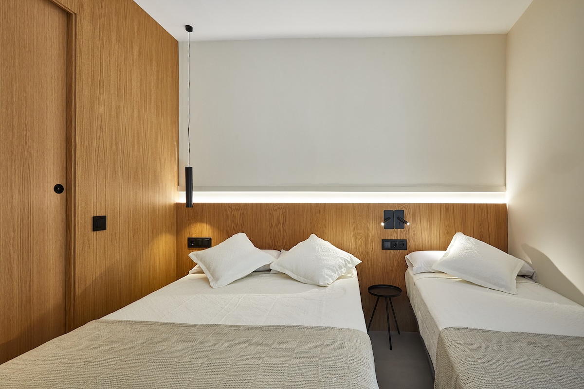 Modern and cozy exterior double room at Hostemplo Sagrada Familia. Equipped with a full private bathroom, air conditioning (hot/cold), TV, and either a double bed or two single beds (upon request, subject to availability). For your convenience, we offer coffee with milk and snacks at reception. Each room maintains the same style and level of comfort, although there may be slight variations in their layout or décor.