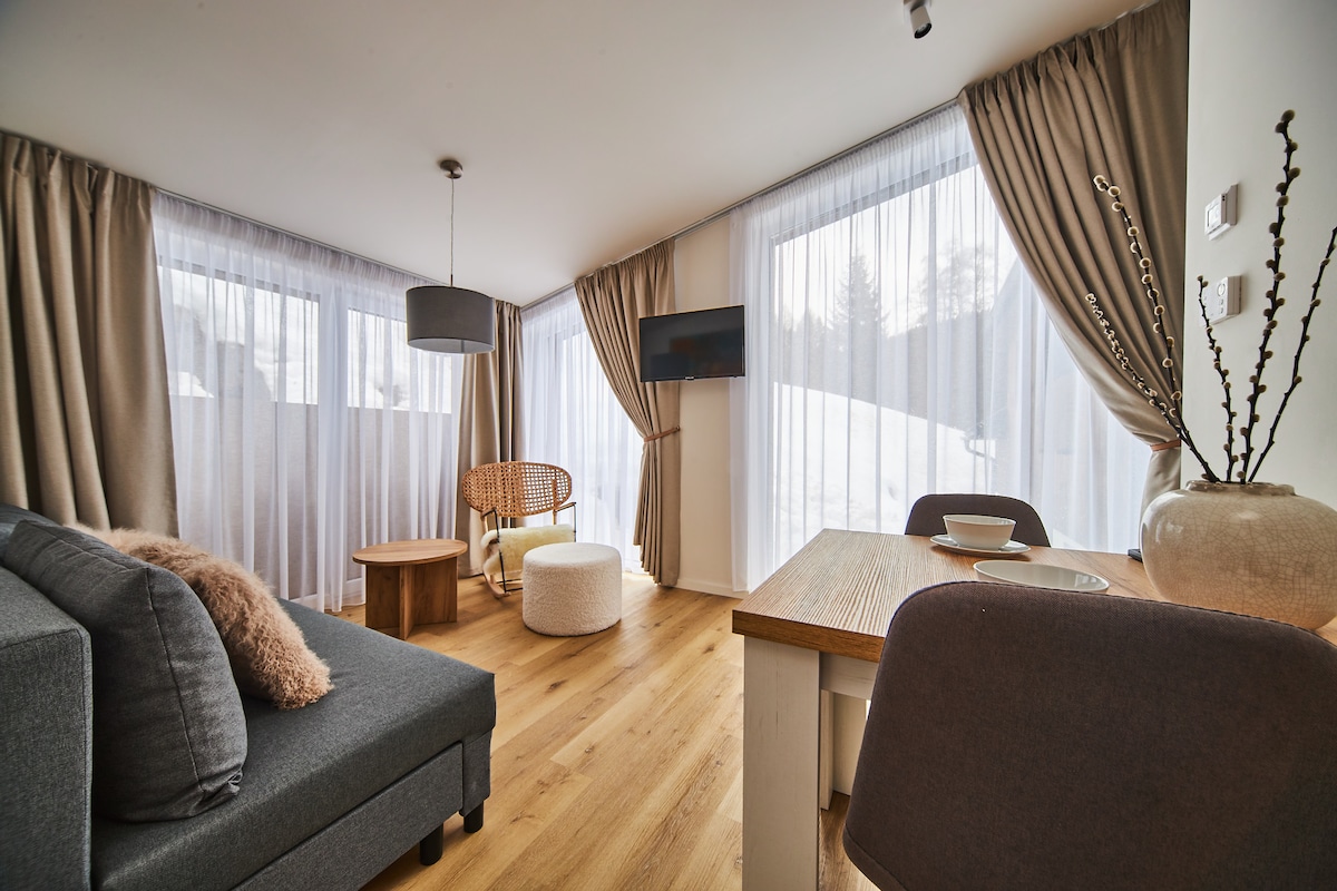 Vzdušný a prostorný apartmán uspokojí všechny vaše touhy po moderním ubytování s vlastním wellness až pro 4 osoby. Apartmán s king size manželskou postelí (180x200) a rozkládací sofou v obývacím pokojem až pro 2 osoby, kuchyňským koutem a terasou s vířivou vanou. Přímo z vířivky se pak můžete kochat panoramatickým výhledem na okolní hory. Co více si přát? Dejte si nohy na stůl a odpočiň si v tomto klidném, stylovém ubytování. Součástí budovy je i finská sauna.
