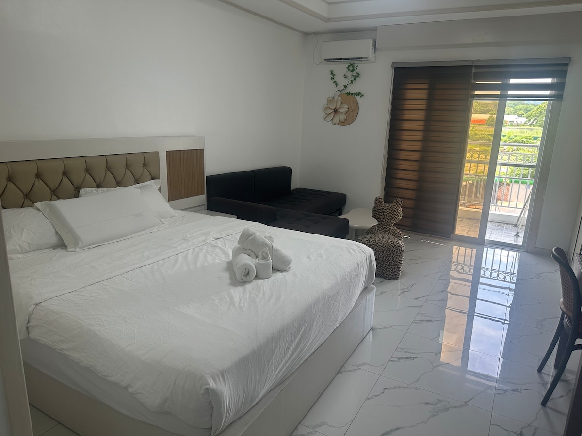 🌿Cozy studio with Netflix & YouTube Premium. Enjoy Mount Arayat views from the balcony with a rocking chair & high table. Sleeps 4 with Queen and a sofa bed. Family-friendly with baby utensils. Vanity mirror with lights, perfect for Zoom calls. Indoor-outdoor hotel-style living with lush greenery. Includes guest hotel kit & workspace. Near Clark airport and CDC parade grounds. Located inside Clark Global City and behind the Hilton Hotel. Parking and Pool access are FREE. Near Aqua Planet!
