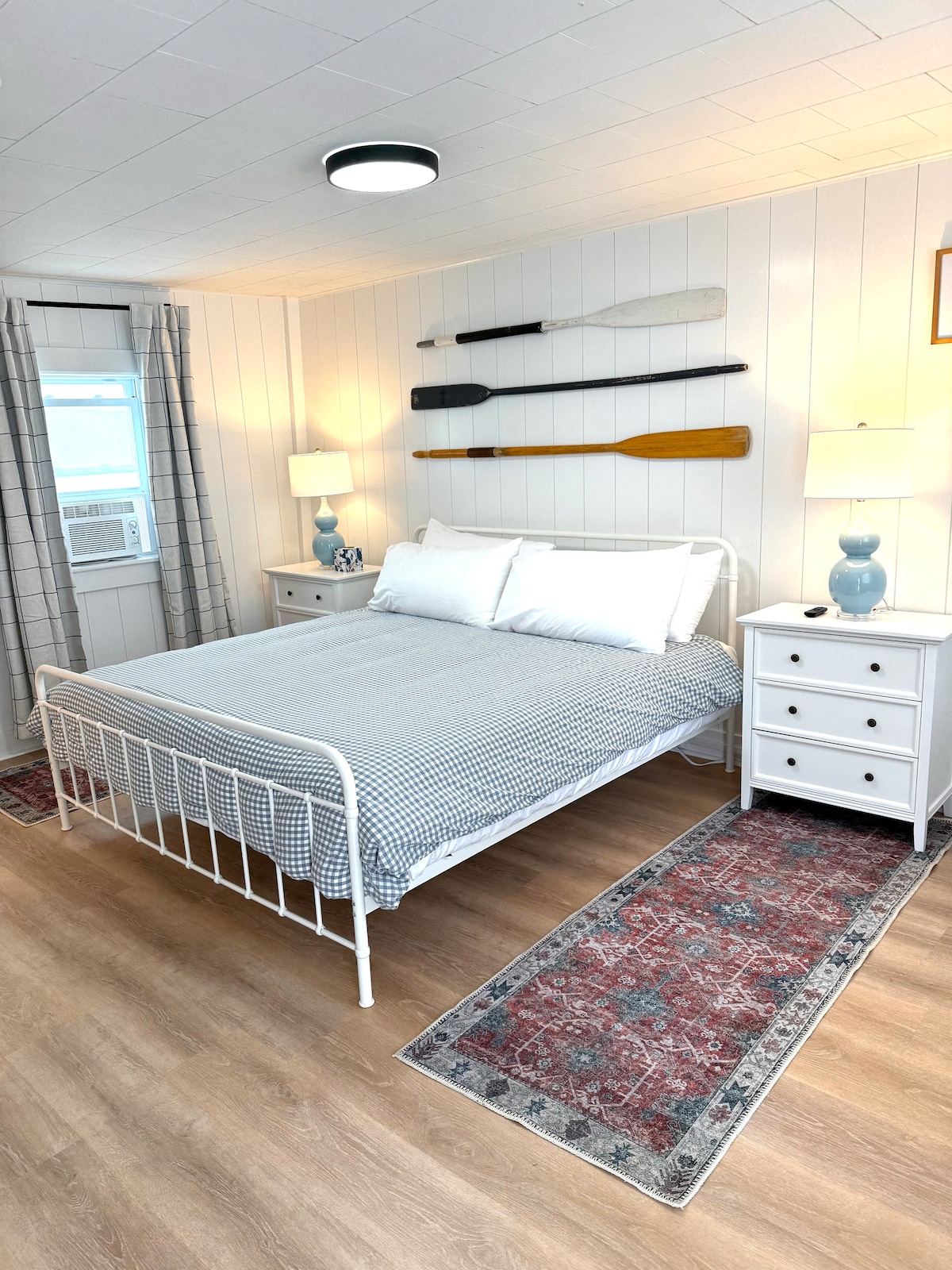 This comfortable single queen room features a full bathroom, dedicated parking, and amenities including a microwave, refrigerator, free wi-fi, and a Smart-TV. Also included is a large common greenspace with lawn chairs, propane grills, and a private dog-park. An ocean beach, several restaurants, a general store, and a specialty wine and cheese shop are within easy walking distance.