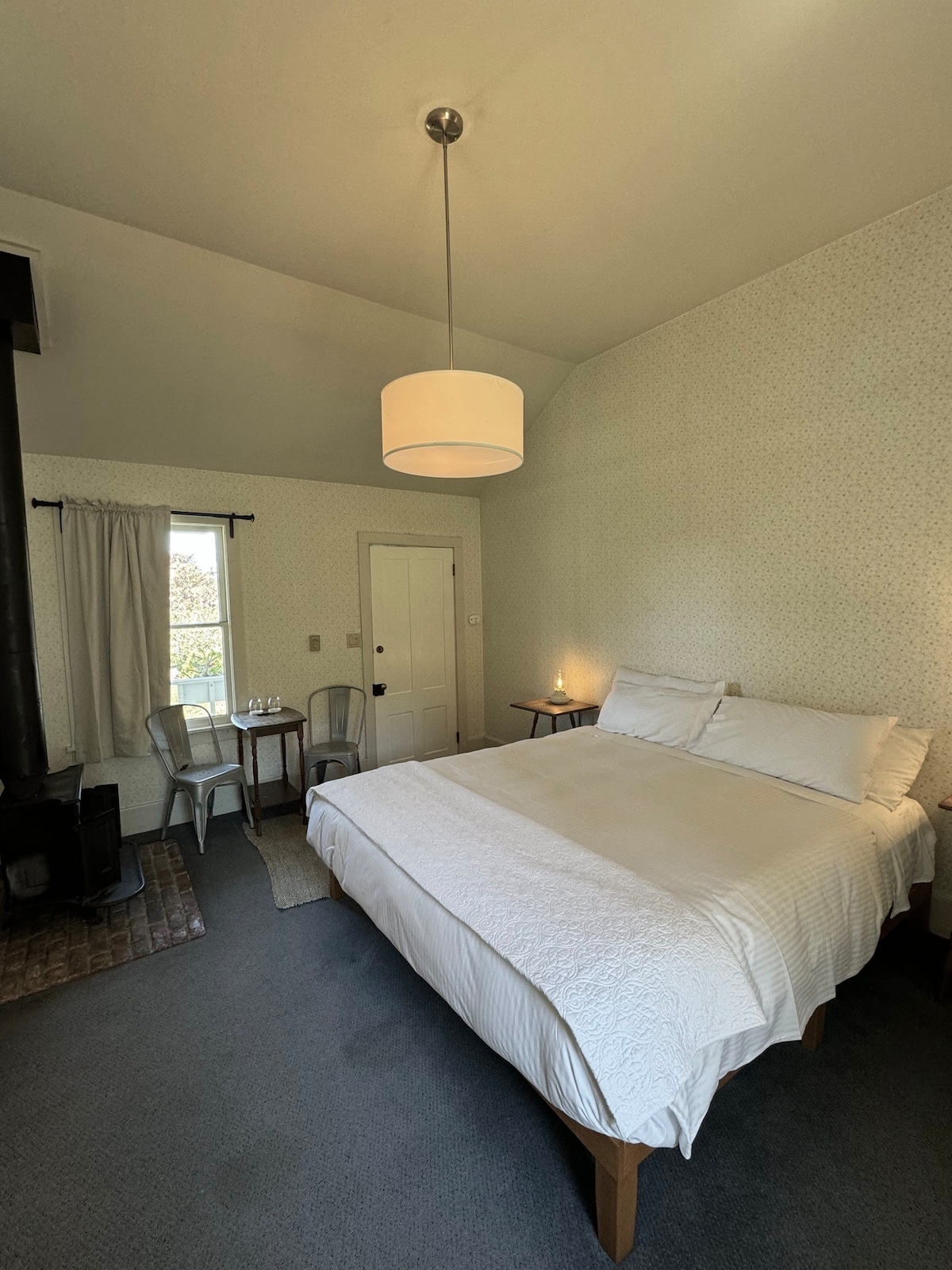 Daisy’s Room at Dennen’s Victorian Farmhouse is a charming cottage-style room that features a queen size bed, a large wood-burning fireplace with duraflame logs provided, and views of the garden and orchard. This is a pet friendly room. Enjoy complimentary access to our communal tea room, which offers a curated selection of local teas.