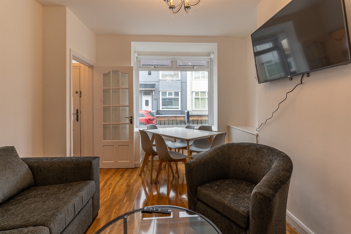此訂單適用於整套房子的所有四間臥室。步行5分鐘即可抵達利物浦足球會的安菲爾德球場。 在公園旁邊的安靜小巷,有路邊泊車位(需有許可證)。 這間全新翻新的旅居很大,裝飾精美,是放鬆身心的好地方。 附近有當地酒吧和餐廳,靠近所有前往市中心的巴士路線。 *價格為每人/每晚。*