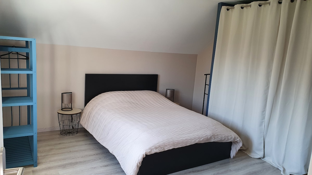 位於市中心,附近有商店,距離旅遊局不到 100 公尺。住宿在私人住宅的後院,由徽章保護,有獨立入口、露臺和私人停車位。無論是一晚或長期住宿,您都可以使用一間配有 160×200 床(提供床單)的臥室、獨立廁所、配有浴巾和洗衣機的淋浴間、配有電磁爐、烤箱、微波爐、冰箱和冷凍庫的廚房。