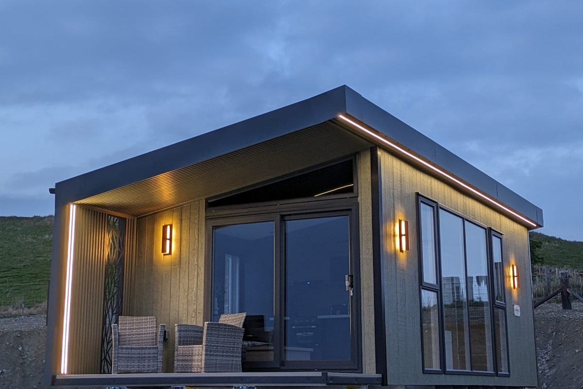 Unique timber cabin looking out onto fields and mountains. Tastefully decorated and new in 2023. Wood-burner, covered veranda, Wi-fi and Netflix, one bedroom, bathroom with shower and double basins, fully equipped kitchen with dishwasher and washing machine. Walks right from the door, private and not overlooked, Mach Loop in the same valley. Pub within walking distance (roughly 20 mins, sensible footwear recommended). Not suitable for people with disabilities or mobility problems. Sorry no dogs.