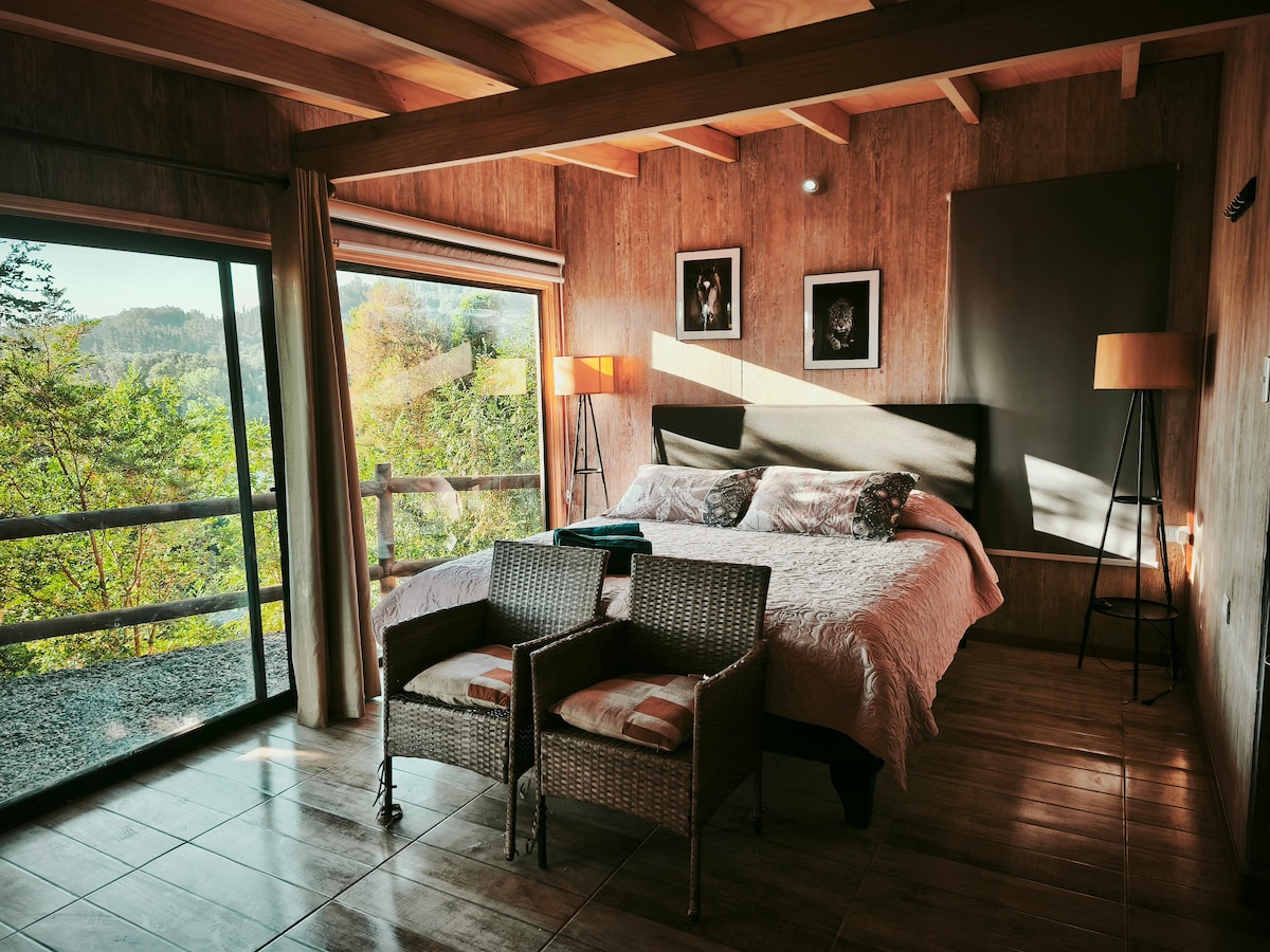 複式公寓,可供2人入住。距離地面7公尺。2英畝的私人公園。 露臺上有無限的全景,還有一座懸掛的橋樑,讓您的夢想飛翔。 隔熱、雙層玻璃窗、地暖和慢燃壁爐。 大牀。書桌、Wi-Fi、配備冰箱的全套廚房、電磁爐和所有必要的餐具,讓您享受住宿體驗。 全套浴室,配有淋浴間,可欣賞迷人的景觀、毛巾、吹風機、坐浴盆!、火坑、燒烤和停車場。距離鋪面道路上的Pucón 6公裏。 由其主人奔跑。