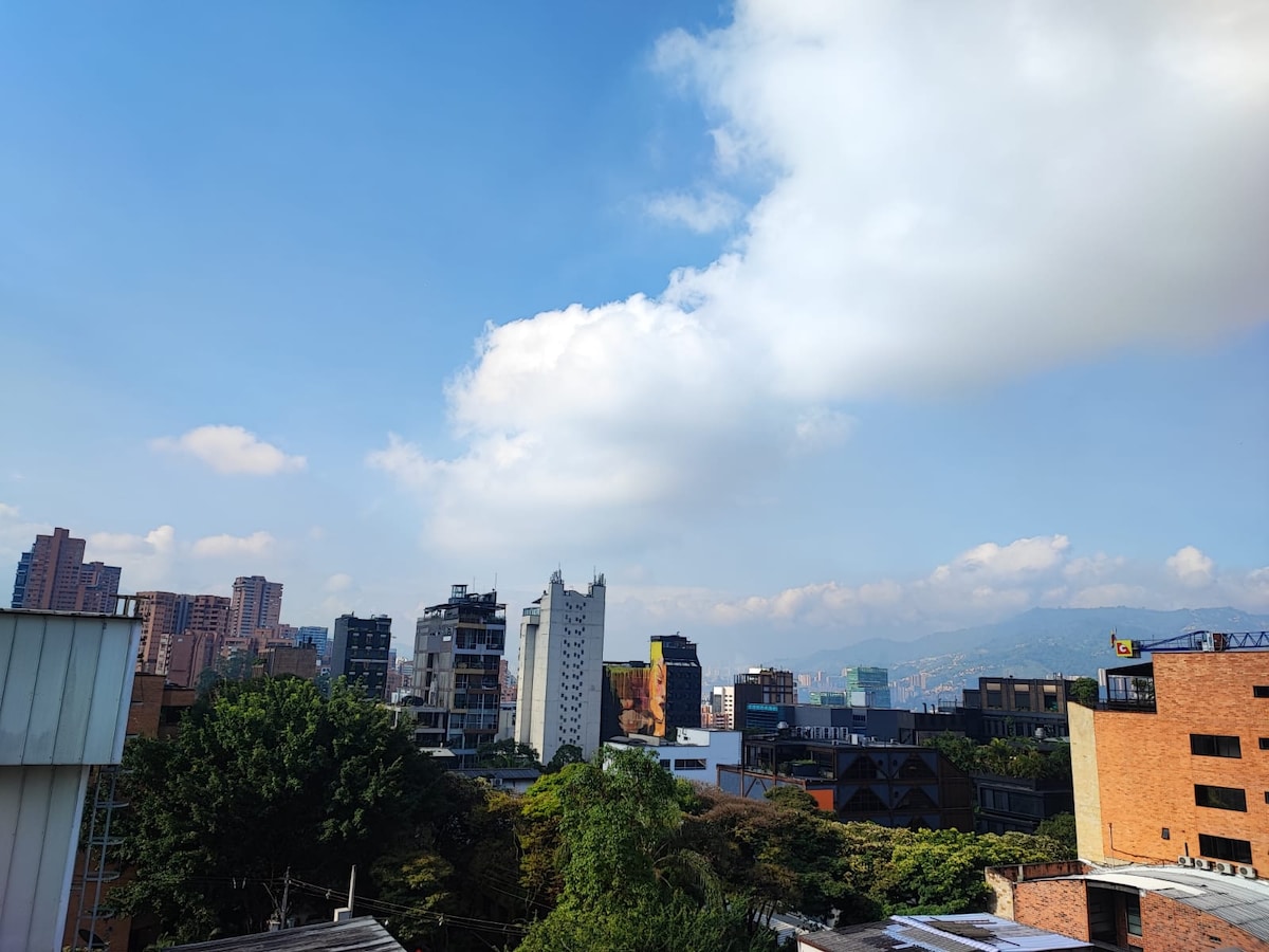 RECENTLY RENOVATED -High-speed internet great for remote work -Brand new A/C -Fully renovated Industrial design apartment -King size bed -Breathtaking views of Medellín (trust me, worthwhile to stay here) -19th floor -Unbeatable location in Poblado near to Provenza and Lleras Park -Modern amenities -Spacious living area -Smart TV x 2 -Fully equipped kitchen -Washer & Dryer Tower -Pool -Gym -Coworking space -Restaurant inside the building -Private parking -Self check-in -24/7 Security