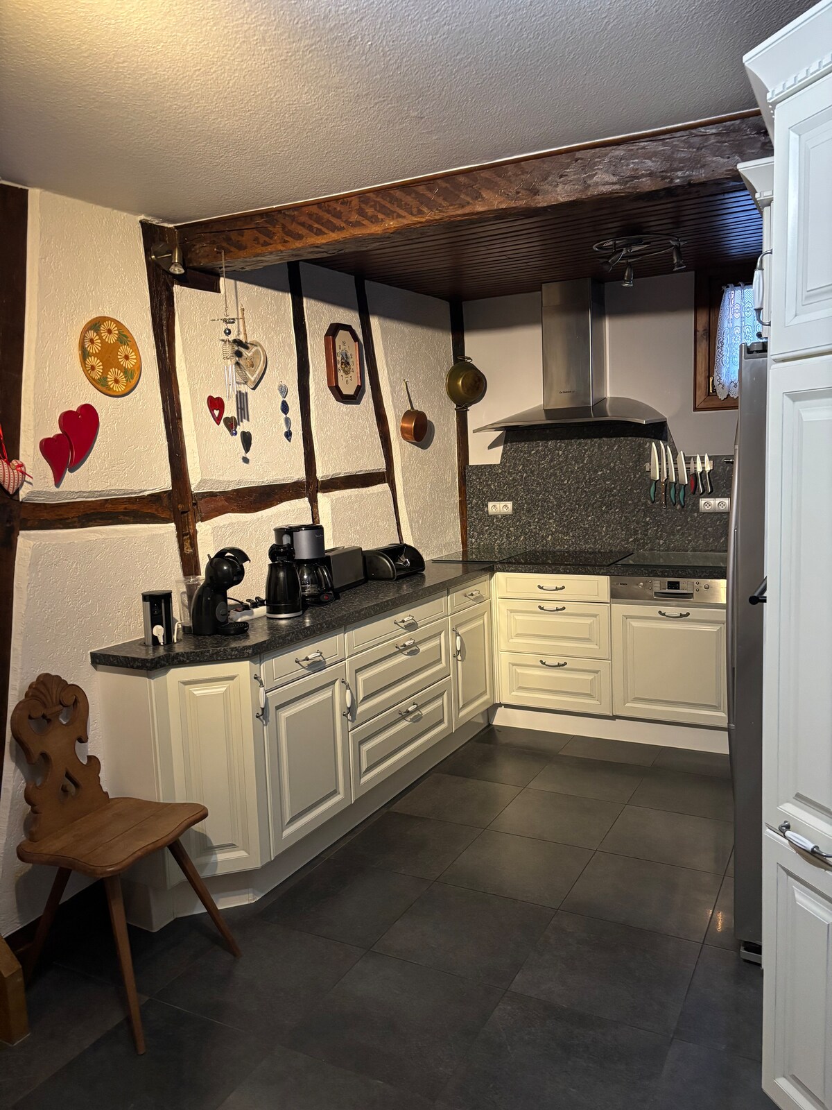 Der EyerHof- seit drei Generationen im Besitz der Familie Eyer - ein über 120 Jahre altes Bauernhaus das von 2019 - 2022 kernsaniert wurde und nun den besonderen Charme eines Bauernhauses mit modernem Industrial- Style verbindet. NebenTerrasse , Hof und Garten gibt es eine Grillstation mit großem neuen Rösle Gasgrill & die Scheune die als gemütlich Lounge genutzt werden kann . Das Interieur des Hauses verbindet Fachwerk mit modernem Eisen, Holz , Sandstein , Lehmwände und alt mit Neu 🖤