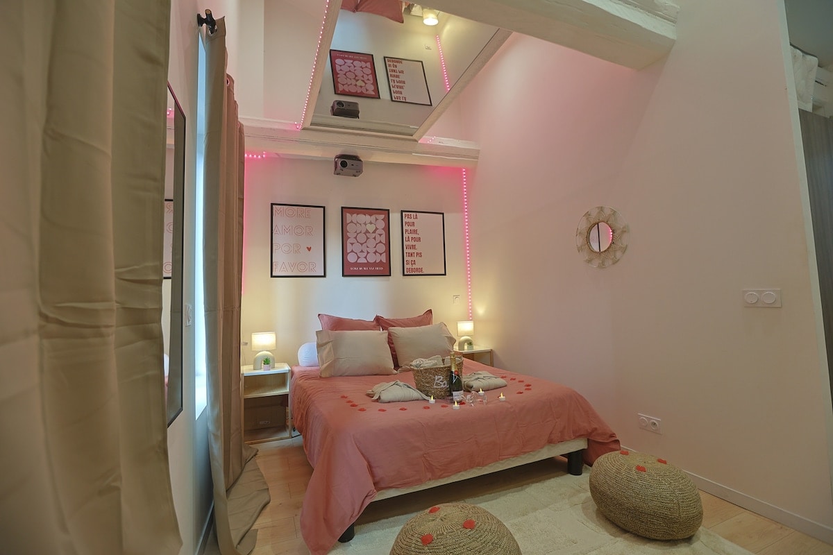 探索我們在聖埃蒂安的家的卓越魅力。 星空下的夾層和迷人的網在等著你。 在牀上或網上使用影片投影機,享受雙人浴缸、壁爐和巨大的螢幕。 私人車庫和自動入口確保舒適和隱私。 這個獨特的空間距離Stade Geoffroy Guichard和Zenith僅幾步之遙,為您帶來浪漫而神奇的度假體驗。