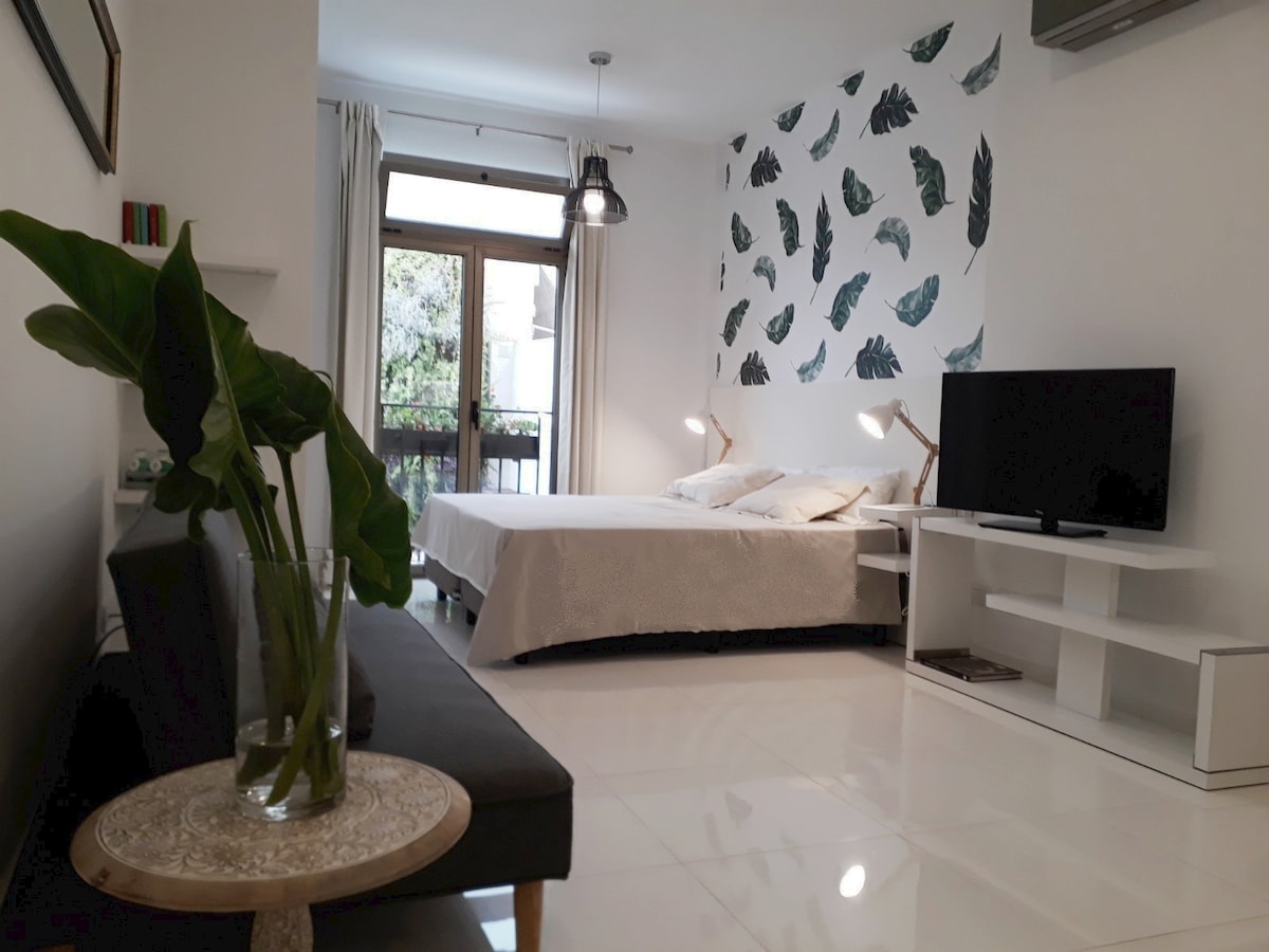 在這個安靜優雅的空間放鬆身心。 34 平方公尺的公寓,可供 1、2 和 3 人舒適入住,配有雙人床(優質床墊和枕頭)和 1 張單人沙發床。 配備遮光窗簾、冷暖空調、WiFi、40 吋電視(配有 Chromecast)、配備冰箱、微波爐、爐具/烤箱、電熱水壺、電咖啡機、烤麵包機和全套餐具的寬敞廚房,供房客烹飪。