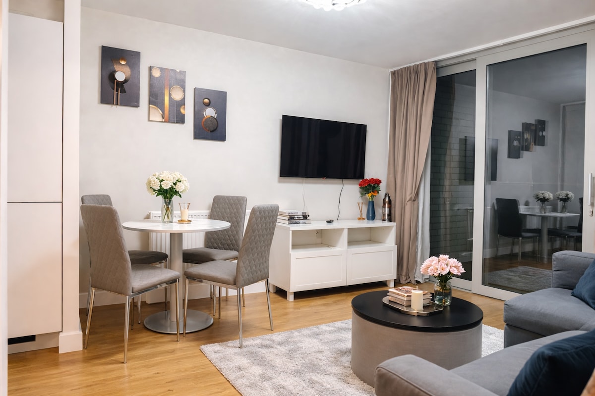 新裝修的大型公寓,距離地鐵、超市1分鐘路程。 前往倫敦所有主要景點非常快。 = >免費停車位 = >乘船12分鐘即可抵達O2競技場 = > 11分鐘即可抵達大本鐘 = >距倫敦市中心8分鐘 = >距離金絲雀碼頭( Canary Wharf ) 9分鐘 = >距離倫敦城市機場20分鐘+ Excel 20分鐘