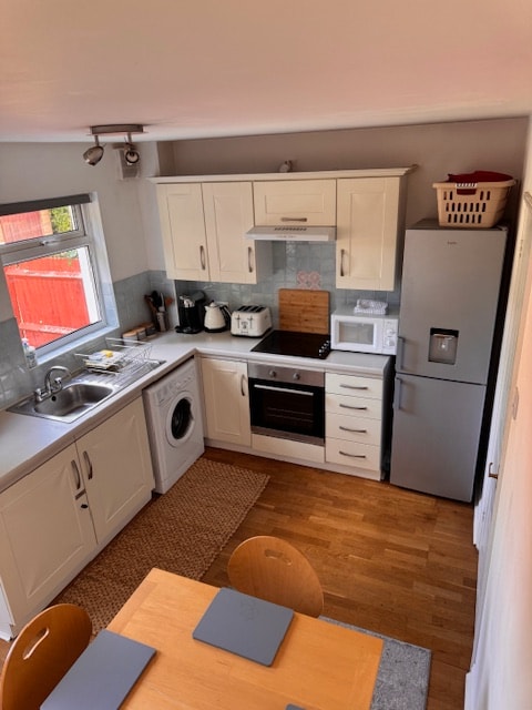 位於市中心,但在高街後面! 設有開放式廚房/起居區域、93 mbps WiFi、50英寸智慧電視、洗衣機/烘乾機和陽臺。 廚房配有全套冰箱冰櫃和洗碗機。 起居區有餐桌、沙發、沙發牀和咖啡桌。 兩間臥室均配有拉鍊和連接牀,因此您可以選擇加大雙人牀或雙人單人牀。 包括帶閱讀燈的衣櫃和牀頭櫃。 為咖啡愛好者提供濃縮咖啡機!