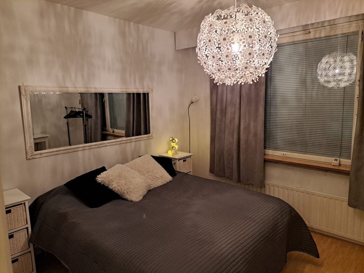 冬日夢幻套房:市中心附近的奢華與放鬆 這間高品質且一塵不染的公寓最多可容納四位房客,並設有私人三溫暖和舒適的陽臺。 地理位置完美:安靜的環境確保安寧的夜晚,但步行即可抵達市中心及其服務和景點。 斯堪的納維亞風格的二樓公寓,配有寬敞的起居室、配有雙人床的壁室、三溫暖和家具陽臺。設備齊全的廚房。
