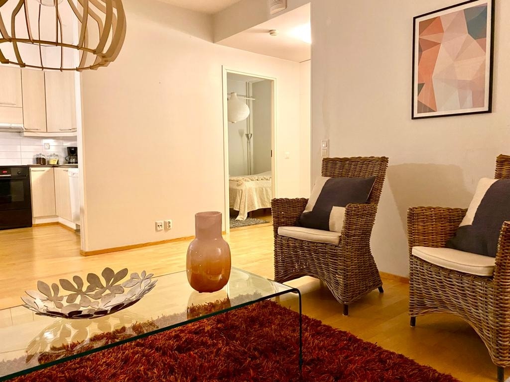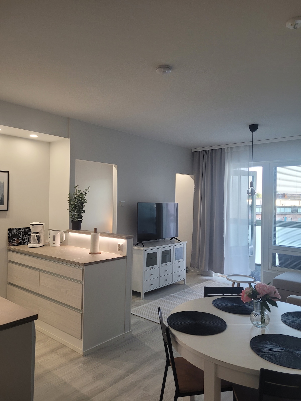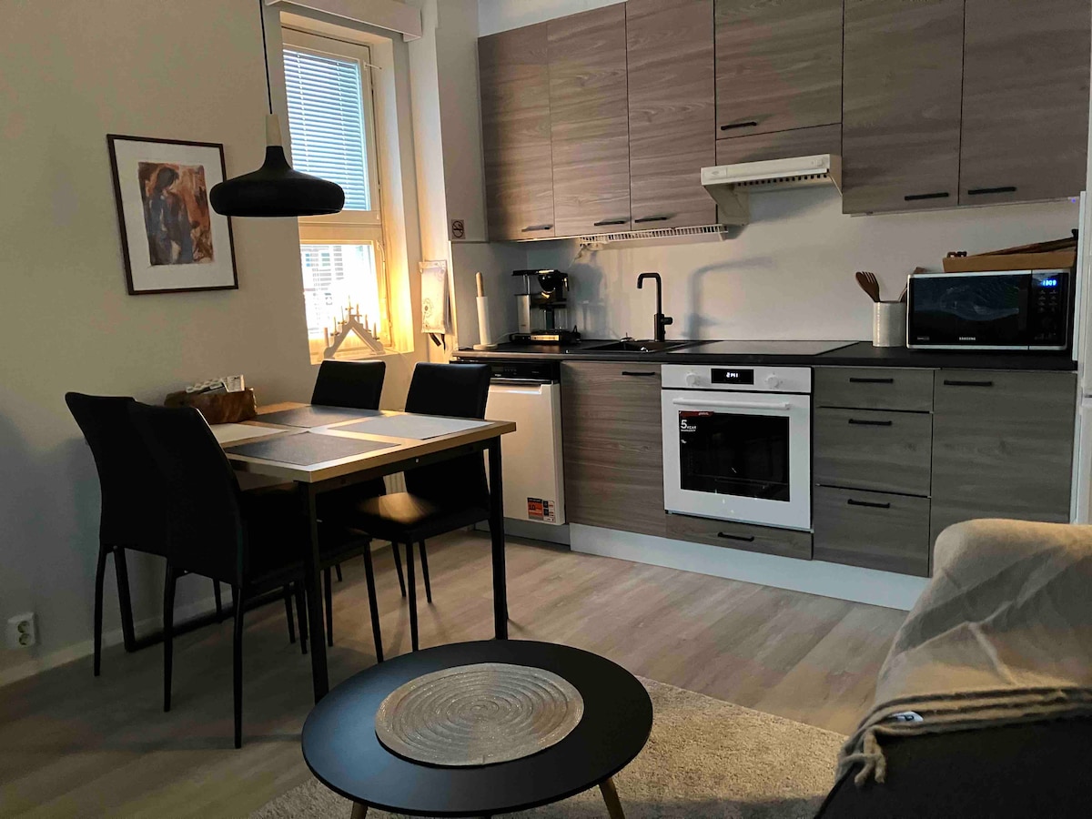 Winter Dream Suite – Luxury and Relaxation Near the City Center This high-quality and spotless apartment accommodates up to four guests and features a private sauna and a cozy balcony. The location is perfect: a peaceful setting ensures restful nights, yet the city center with its services and attractions is just a short walk away. Scandinavian style 2nd floor apartment has a large living room, alcove with queen size bed, sauna and furnished balcony. Fully equipped kitchen.
