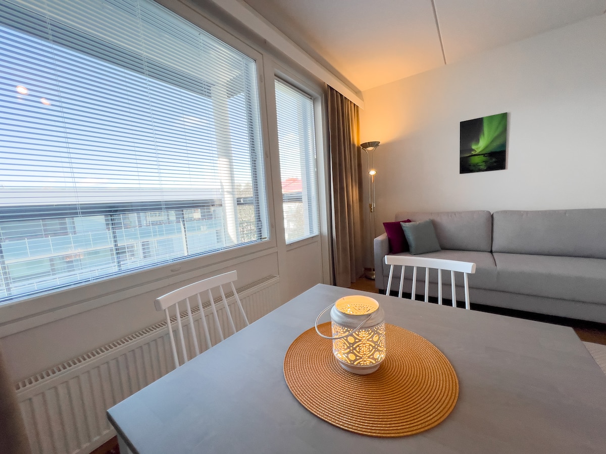 A modern scandinavian style apartment (39 sq.) close to Rovaniemi city center with nice river and city view. Our apartment has private entrance and can comfortably fit up to four persons. Ounasvaara hiking just around the corner, city center with many restaurants and attractions reachable by walking. Kitchen/sauna/shower/toilet/aircon/washing machine/air dryer/bed linen and towels included/TV/Chromecast/Free Wi-Fi/furnished private terrace/car heating socket.