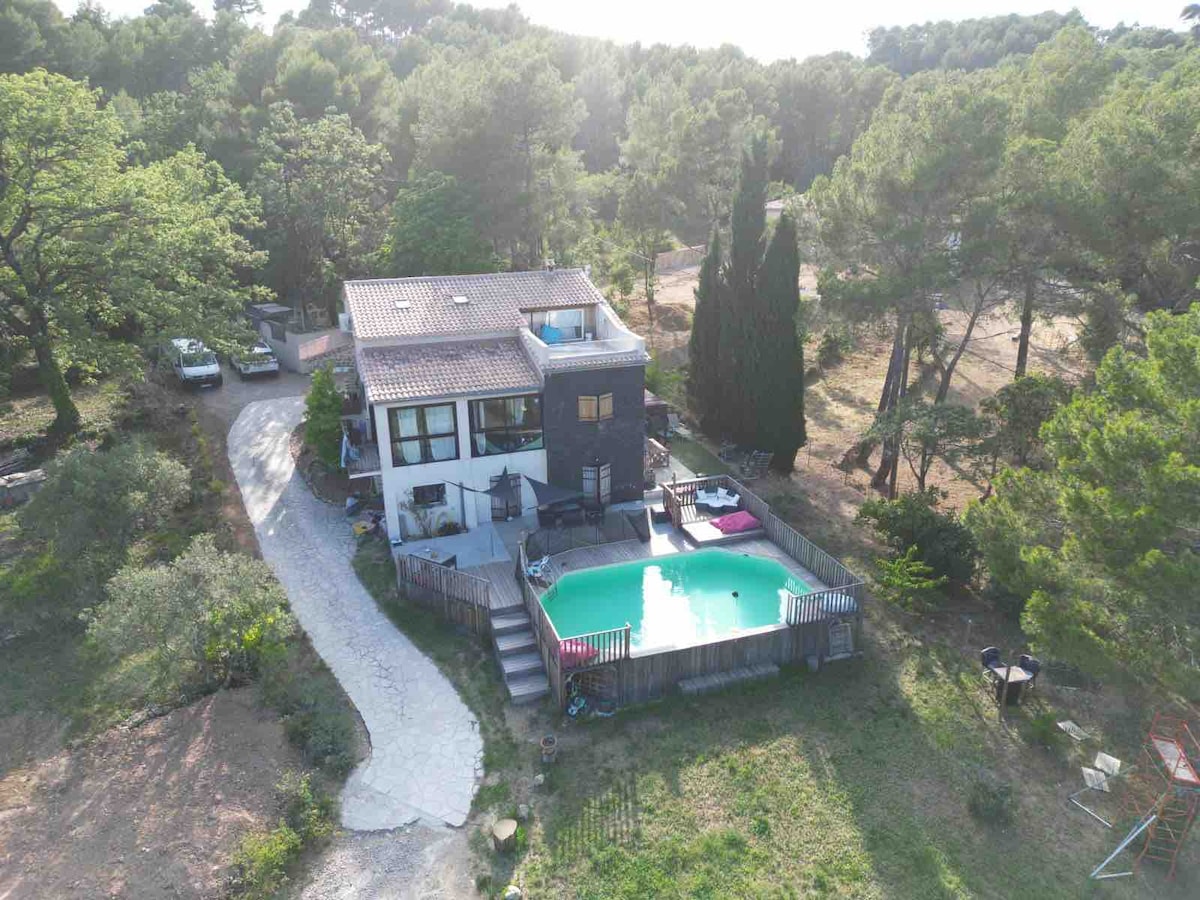 樹林後面的不尋常的房子。 在綠色的普羅旺斯,坐落在森林、橄欖樹、灌木叢和藤蔓之間。 冬季柴火、遊泳池、petanque球場、午睡、冥想、瑜伽或在森林中的寶塔下閱讀。 在鄉村,環境極佳。 舒適的空調小木屋,安靜,可充電和斷開連接。 停車位。供我們的動物朋友使用的圍欄。 參觀美麗景點的絕佳假期。