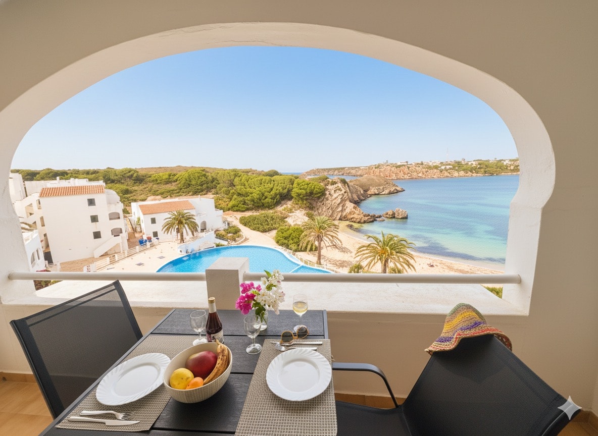 Acogedor apartamento de 40 m² con 2 terrazas privadas y vistas al mar, ideal para relajarse en Menorca. 1 habitación, 1 baño, salón con cocina integrada y 2 camas de matrimonio (para 4 personas). Perfecto para parejas o familias pequeñas. Situado en un complejo familiar tranquilo con zonas verdes, cerca de supermercados, parada de autobús y GR. A solo 200 m de la bahía de Arenal d’en Castell, disfruta de sol, mar y actividades al aire libre. ¡Vacaciones inolvidables con todas las comodidades!