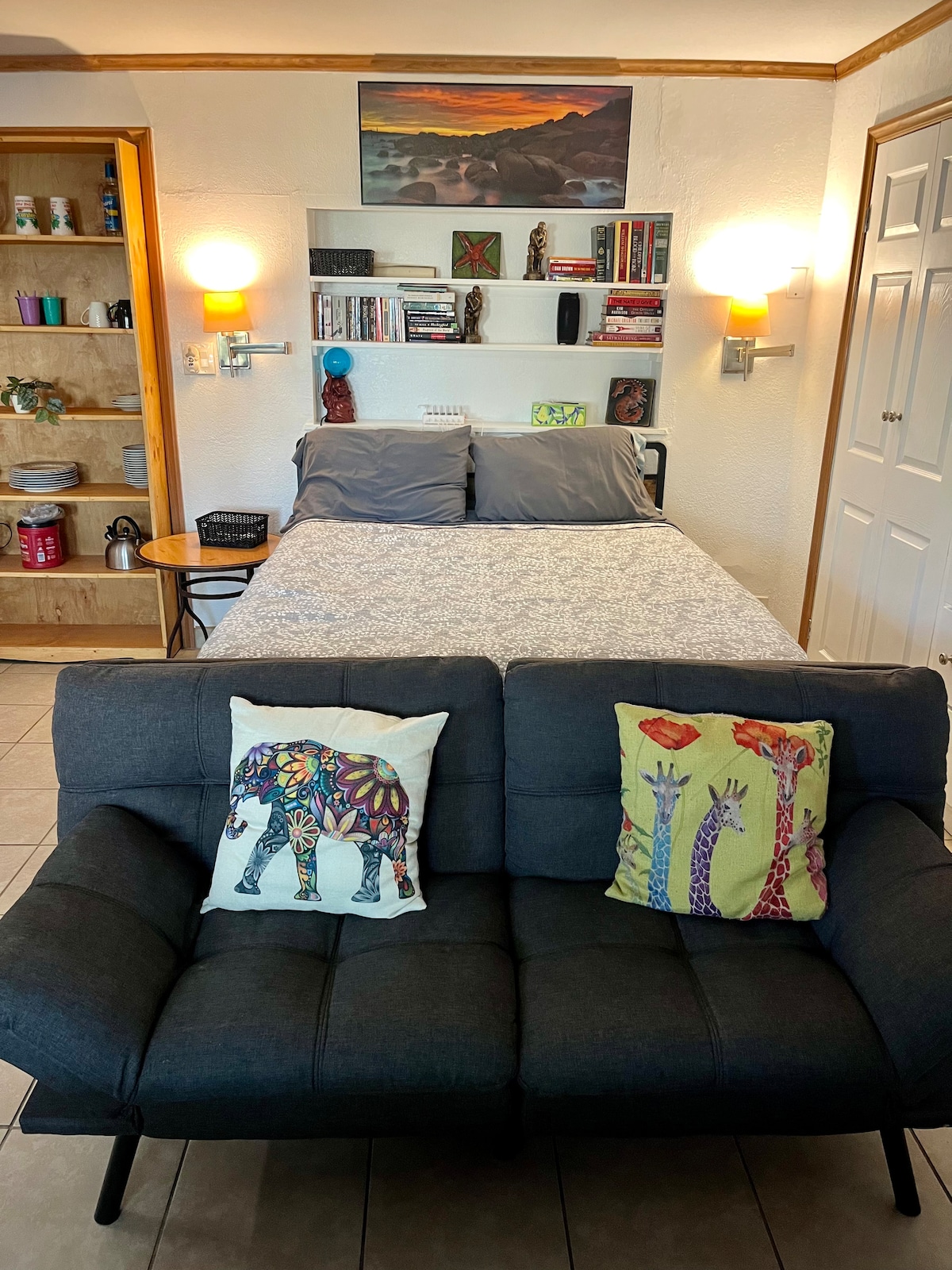 Large ,clean, bright space for work or leisure . Desk and chair , Wi-Fi, cable TV . Queen bed , bedside tables and lamps, clothes rack , iron and ironing board . Day bed to relax or accommodate another person. Kitchenette , prep area , full fridge , gas stove . microwave , Keurig, and cooking utensils . Private bathroom , with walk in shower . Private outdoor sitting area, yard enclosed. Outdoor gas grill . Discounts available for weekly and monthly rates . Dog friendly ,no cats.