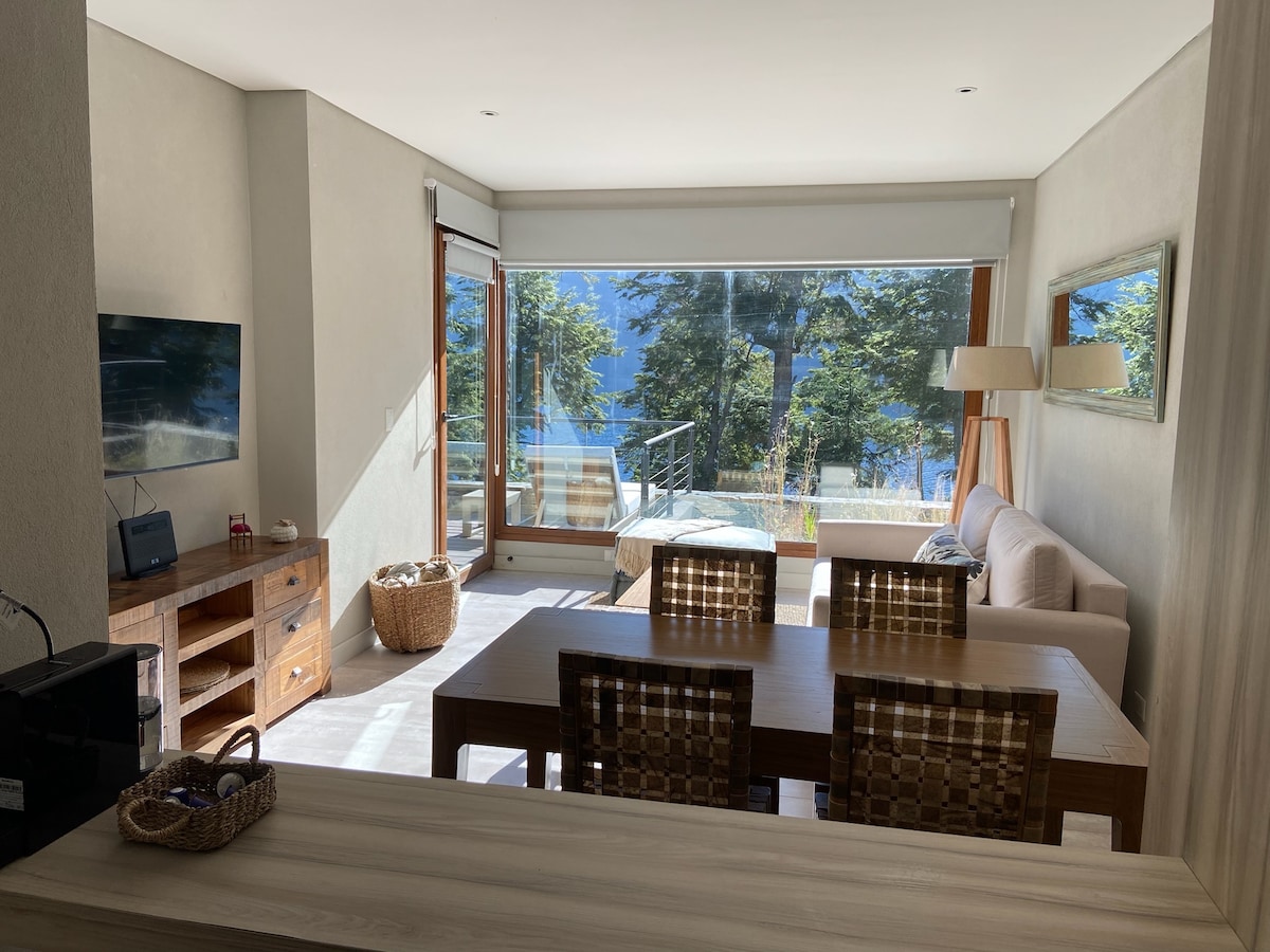 Es un cómodo y luminoso apartamento a orillas del Lago Nahuel Huapi, con excelentes vistas, de día y de noche. Podrás ver la ciudad de Bariloche, el lago, las montañas y el imponente Cerro Catedral. El complejo Villa Huapi se encuentra entre el lago y la ruta N° 40. A sólo 15' minutos de Bariloche y a 10' del Aeropuerto Internacional de Bariloche Es un espacio con todo el confort rodeado de montañas, lagos y en una ubicación estratégica para conectarse con la ruta de los siete lagos