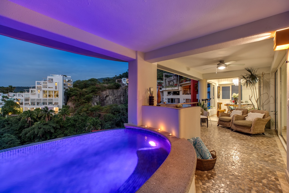 這間迷人的頂層公寓配有閣樓臥室,通過寬敞的玻璃滑動門通往全長露臺,邀請您欣賞班德拉斯灣和浪漫區的壯麗景色。 高拱頂天花板讓這間750平方英尺的公寓感覺寬敞開放。以現代裝潢更新,同時保留墨西哥風格的品味。