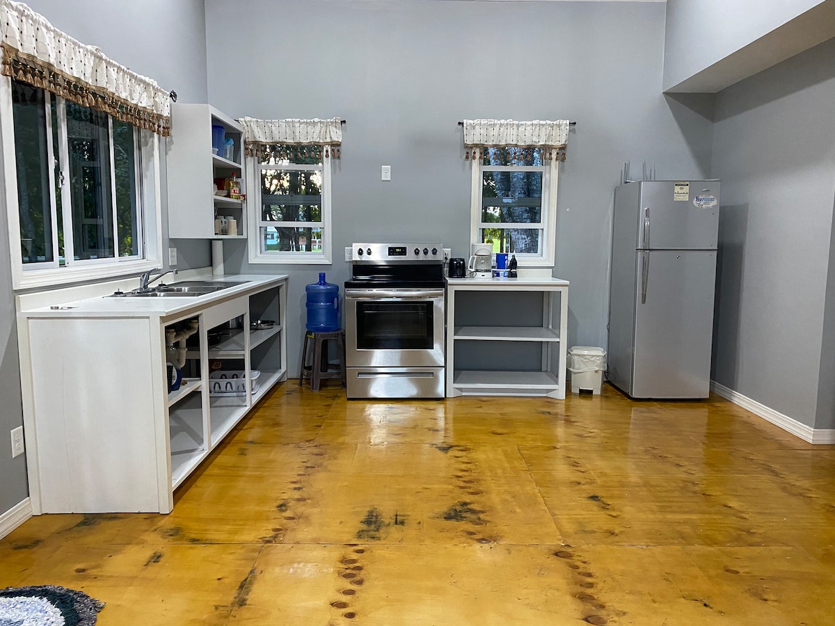 Our Belize jungle treehouse blends comfort with nature, offering a loft with two queen beds, a pull-out couch that converts into a full-size bed, and a large desk for work and TV. Enjoy a full bathroom with a spacious shower, a kitchenette with a sink, mini fridge, cooktop, and coffee maker. The screened-in porch lets you listen to the creek and enjoy wildlife, all while being just minutes from the vibrant community of Spanish Lookout. Perfect for adventurers and nature lovers.