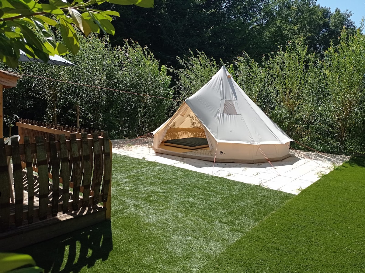 Trés grande tente posée sur une terrasse au milieu d'une prairie en bord de forêt sur 8 hectares. ici vous êtes en harmonie avec la nature, piscine chauffée, toilettes, douche. la surface de couchage est nue : nous vous laissons le soin d'apporter le nécessaire pour dormir.(attention, il peut faire frais la nuit, vous êtes en forêt !) le prix indiqué comprend l'accès à 4 personnes pour une nuit; possibilité d'accueillir des personnes supplémentaires pour 12€/personne/jour.
