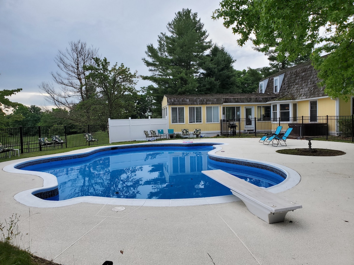 住宅位於5個馬廄上方。 兩間臥室的房子,有2間浴室、Juliette陽台、拱形天花板、設備齊全的廚房、洗衣房。 傳統的英國馬術裝飾,附近有馬術表演和狐狸狩獵。 泳池開放時間: 5/15-10/15。 額外旅人每晚55美元。 每隻寵物費用35美元。 請透過Airbnb提供建議。 可愛的古董、馬術藝術和裝飾、溫暖的地毯。 現場也有~Airbnb: www.airbnb.com/rooms/826639006057875355?guests=1&adults=1&s=67&unique_share_id=4cdf4b76-3173-498a-9287-5ab54a38b4ee