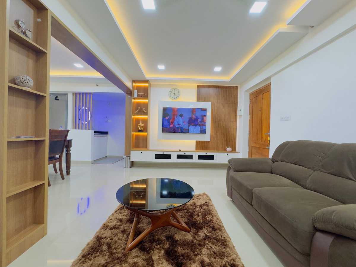 (新房源) 「崔凡特拉姆全新 3 房豪華公寓,全屋空調,室內裝潢時尚,設備現代化。寬敞的臥室,配有舒適的床、乾淨的床單和全新的毛巾、優雅的客廳和設備齊全的廚房。」 步行1分鐘即可抵達BLND Restobar , 距 Infosys 2 分鐘車程, 開車 3 分鐘即可抵達 Lulu Mall & NISH, 距離Kim 's Hospital 5分鐘 5分鐘即可到達科技園區, 距離機場和帕德馬納巴斯瓦米寺廟 10 分鐘 非常適合短期或長期住宿。