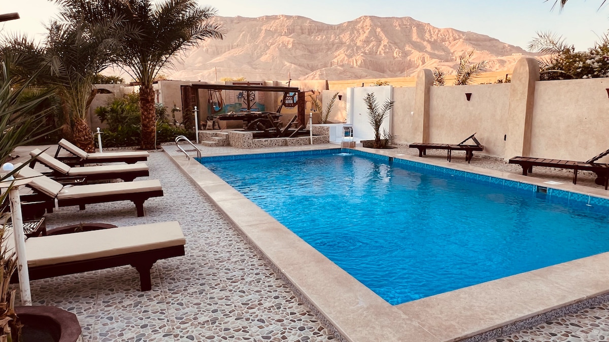 🌿 位於Luxor West Bank的獨特生態旅館—大自然中心的寧靜度假勝地,四周環繞著樹木和花朵,設有泳池和Theban山景觀。 結合傳統魅力和現代舒適的原始土屋。 參觀完寺廟後,在泳池旁放鬆身心,感受這個地方的魔力。 根據要求提供接送、早餐、自製餐點和短途旅行,讓您輕鬆而難忘的入住。 文化、大自然及寧靜融為一體的罕見地方。