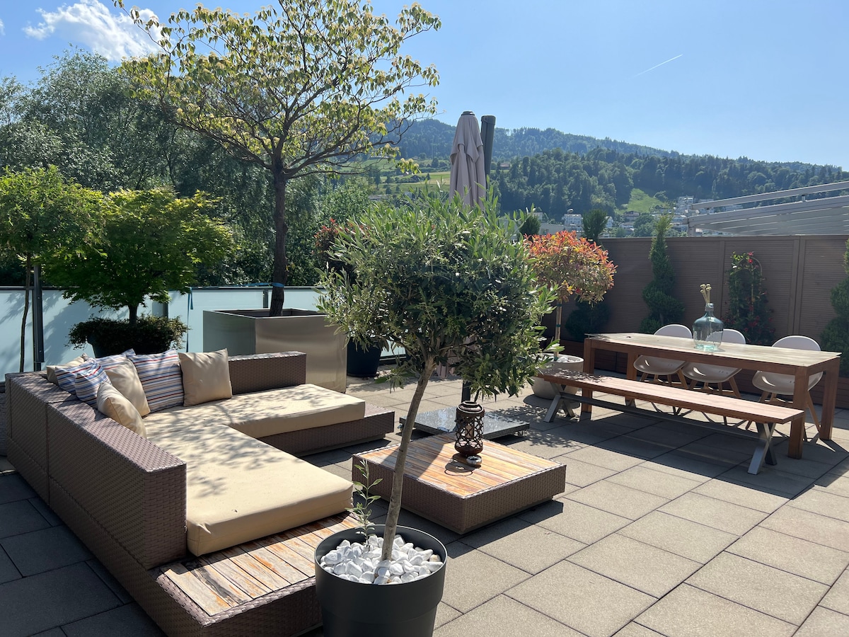 我有一間頂層公寓,可俯瞰Pilatus山,我們的陽臺/露臺面積為70平方米,您可以在我們的躺椅沙發上放鬆身心,或在我們可愛的木製餐廳用餐,四周環繞著我們美麗的植物和花卉。 頂層公寓有3間臥室。閣樓內有100平方米的舒適和裝飾。 主臥配有空調,其他臥室配有風扇。