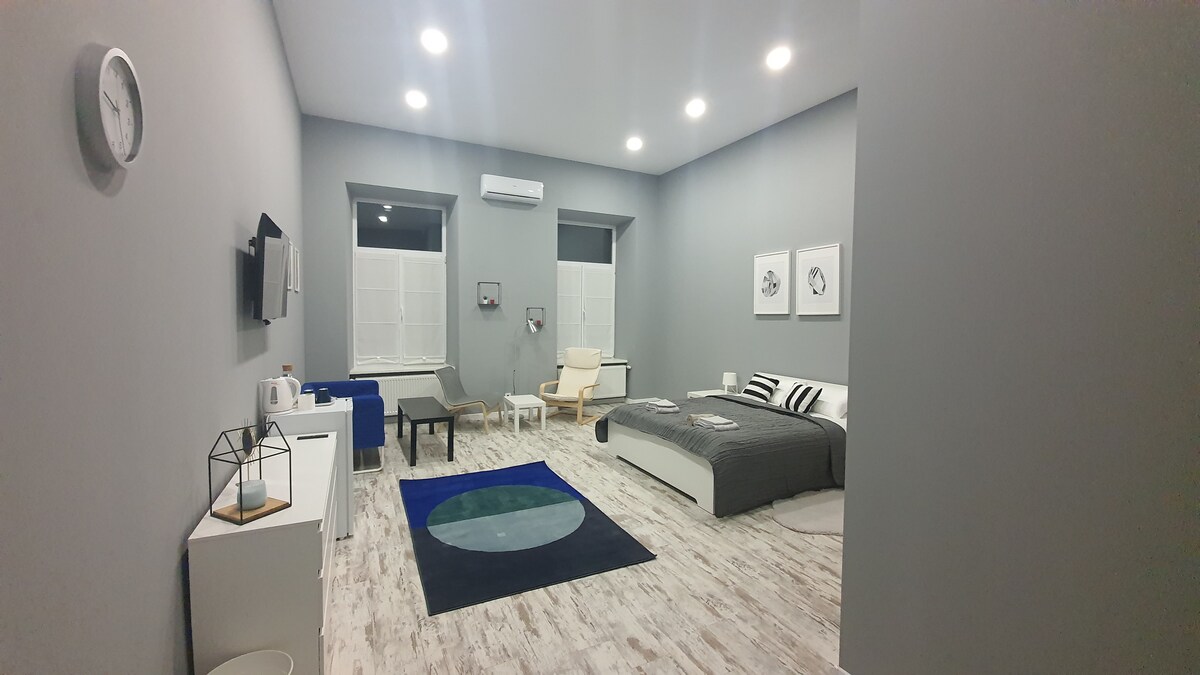時尚現代,在家裡, Kostjukowski是一個理想的地方。 位於市中心安靜社區的設計師公寓。 一間臥室和廚房,寬敞的露臺。 免費地下停車場、WiFi、往返火車站或機場的免費穿梭巴士服務、冰箱填充物、全套品牌化妝品、雜貨籃。