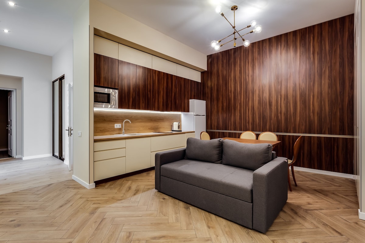 New apartment in the heart of the city located on a quiet street will allow you to relax despite the noise outside the door. The room has everything you need even for your long stay: fitted kitchen, refrigerator, induction hob and everything you need for cooking ,washing machine with dryer,internet and smart tv.Near restaurants,entertainment venues,cathedral,aquarium. Wellcome🩵💛