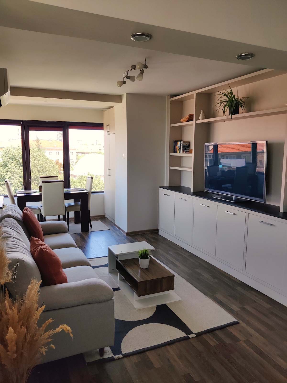Stylish and bright apartment in the very center of Yambol, on a quiet street, with an underground parking space. Suitable for business trips, families, and couples seeking comfort and tranquility. The apartment features a fully equipped kitchen, a separate bedroom, a sofa bed, a balcony, and high-speed internet. We offer automatic discounts for longer stays and the option to extend your stay subject to availability.