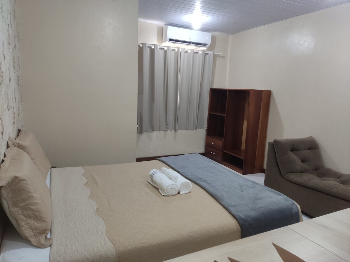 Acomodação confortável para até 5 pessoas, prática e muito bem localizada você estará a poucos minutos do centro, aeroporto e cercado por padarias, restaurantes, farmácias, sorveterias e muito mais O ambiente é completo e equipado para te receber com conforto: 🛏️ Cama aconchegante 📶 Wi-Fi de alta velocidade 🫧Máquina de lavar ❄️ Ar-condicionado ☕ Cozinha com utensílios 🧺 Toalhas e roupa de cama 🧼 Ferro de passar disponível Tudo pensado para que você se sinta em casa