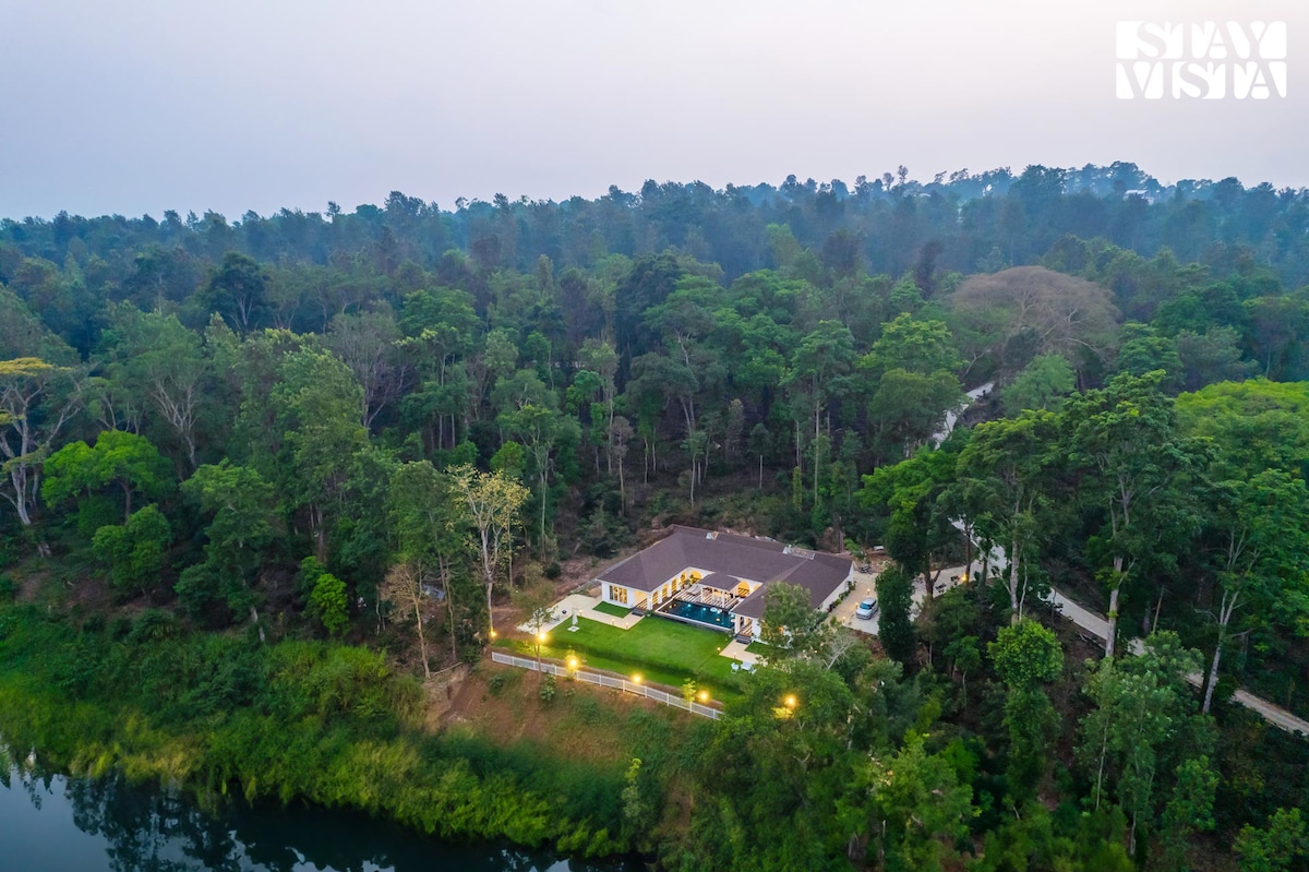 這座寧靜的別墅位於38英畝的咖啡莊園上。別墅有3間大臥室和一個美麗的休息區,可欣賞咖啡莊園的壯觀景色。有游泳池、自行車、許多棋盤遊戲和很棒的莊園步行,您總是有很多事情可以做。房源的一側與寺廟森林接壤。 對於那些必須工作的人,我們有WiFi。來訪我們,享受著名的Kodava待客之道。