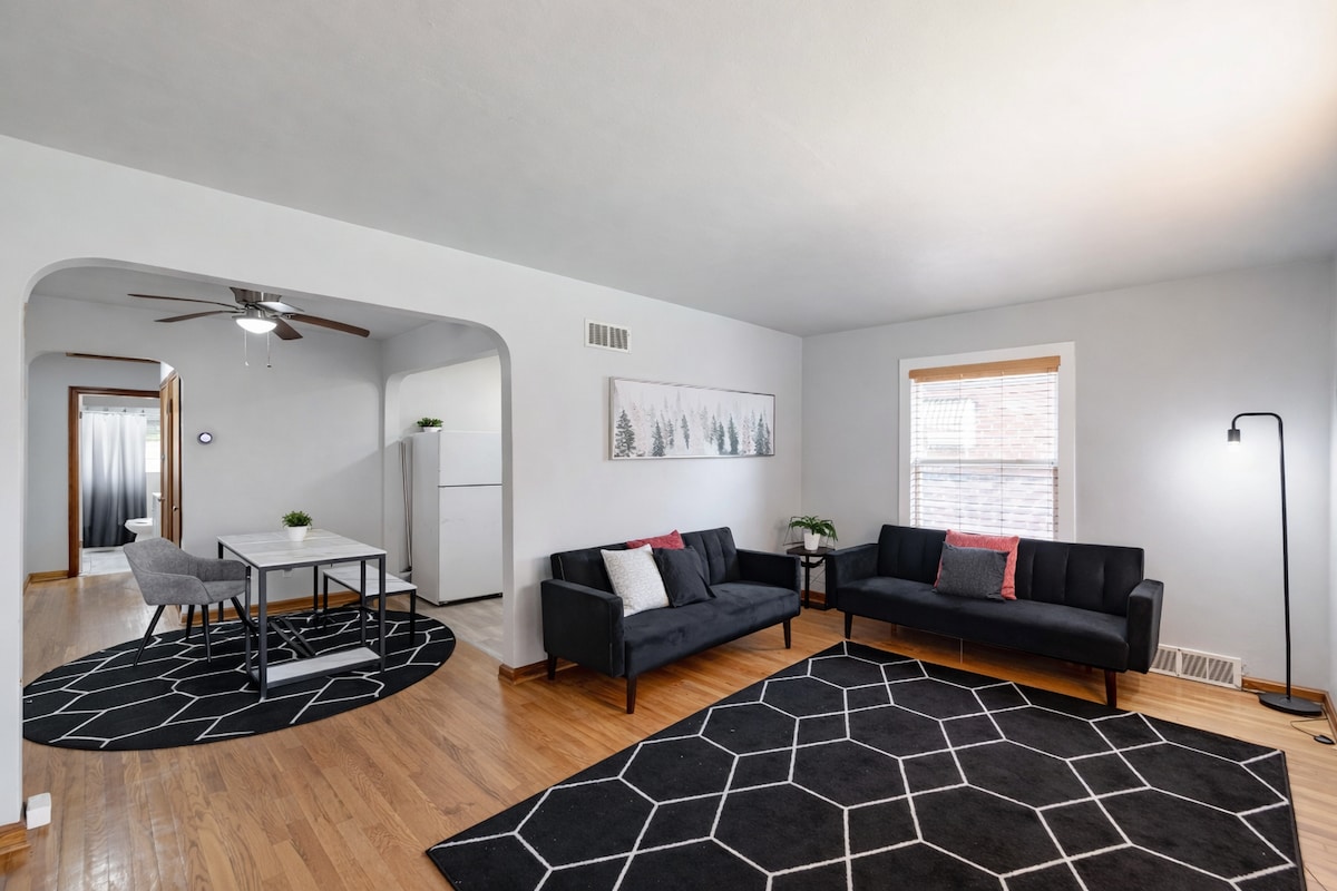 歡迎來到我們迷人的兩臥室牧場,位於270號州際公路旁,位於花崗巖城的安靜社區,距離聖路易斯市中心僅15分鐘車程。 配備全套廚房設施、Roku智慧電視、高速Wi-Fi、安全的街邊停車位、毛絨加大雙人牀和標準雙人牀、舒適的拉出式日式牀墊,以及設備精良的洗衣房,配有全尺寸洗衣機和烘乾機。