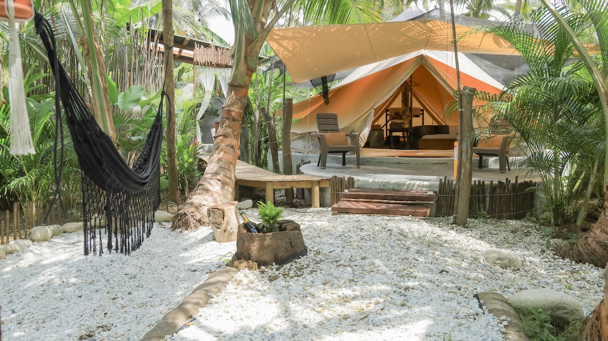 Enjoy a unique experience by the sea, surrounded by nature. Feel the sand under your feet and relax under coconut trees with the sound of the waves. The perfect place to rest and reconnect, with an amazing view from your bed. Just 15 minutes from Tayrona Park and 5 mins from Buritaca, each tent has something special to offer. A space taylormade, where you can enjoy a full open - air experience on the beach.