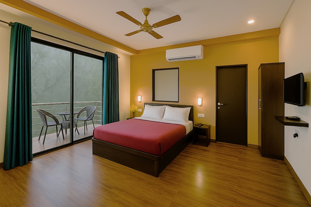 The Deluxe Room offers a cozy and peaceful stay with a beautiful river-view balcony. It features a spacious king-size bed, air conditioning, and a comfortable sitting table with a chair. Guests can enjoy hot and cold water, fresh towels, and soap for a refreshing experience. The room also includes a wardrobe, complimentary Wi-Fi, and a first-aid kit for added comfort and safety. Perfect for travelers seeking relaxation with modern amenities in a serene environment.