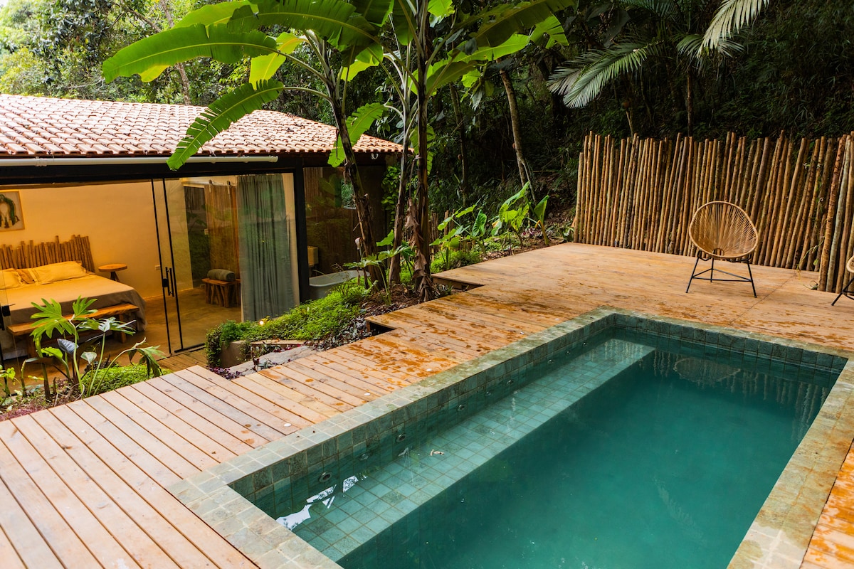 Casa da Ponte 提供六人室外浴缸,讓您直接接觸大自然,玻璃牆和天花板讓您在室內享受綠色,安全舒適。 早晨醒來,晨露和光線從巨大的玻璃牆進入,聽著和觀察著大西洋森林中的動物,彷彿您睡在樹下,但您其實是在一張加大雙人床上,蓋著溫暖的羽絨被,壁爐為房間加溫。來體驗這種感覺吧。