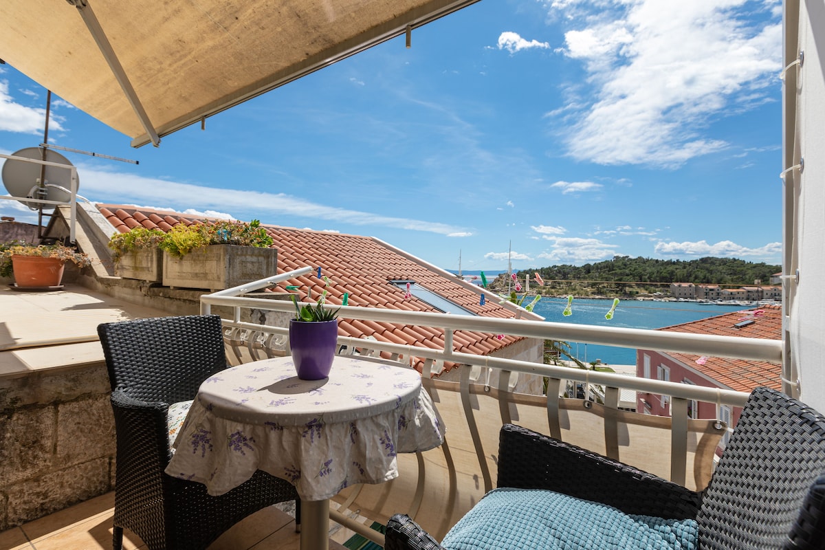 Wake up under a colorful jellyfish before heading through the light blue French doors onto the balcony with views of the sea and the island of Vis. The apartment has a bright white palette with colorful artwork and furnishings. The apartment is freshly renovated and is equipped with basic living equipment such as towels, sheets, blankets,hangers, toilet paper, shower gel,hand soap, hair dryer, first aid kit, microwave, dishes and pots,owen,toster and all the rest cooking equipment. As needed.We are relaxed people who respect privacy :) The apartment is close to the beach in Hvar. It’s a peaceful neighborhood at night. Without any additional costs....... Lift to the apartmant on the arrival and back to the centre on the leaving day are inclouded in the price,aswell as the daily fresh towels :)