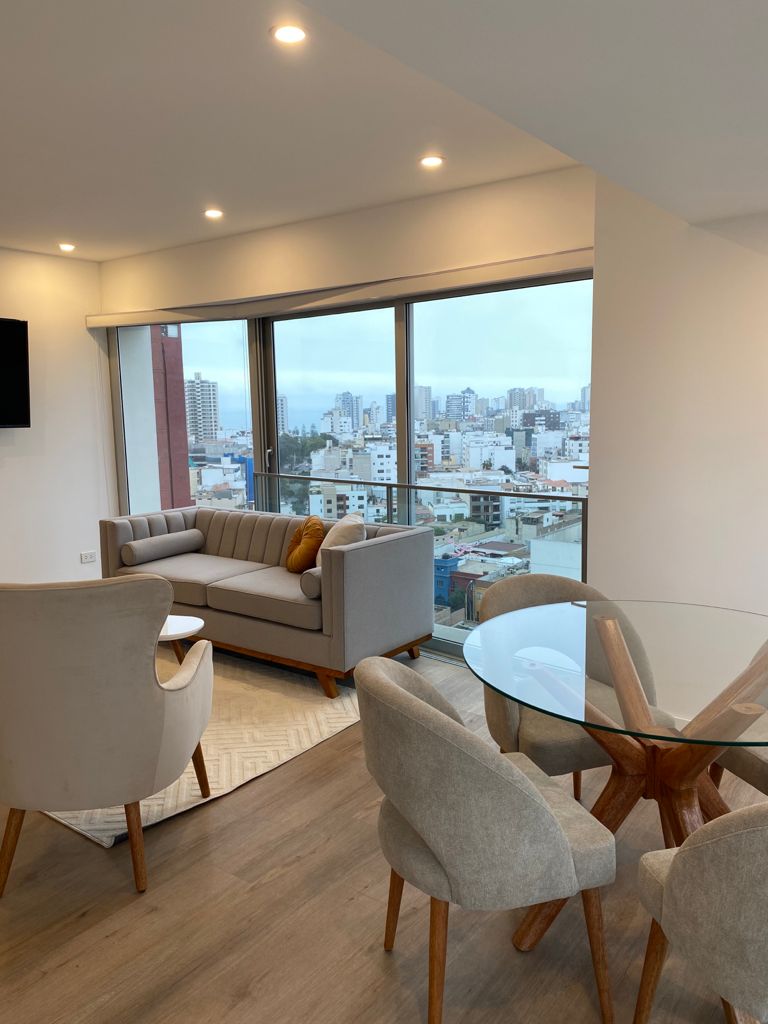 位於利馬米拉弗洛雷斯灣中心最美麗的住宿。現在有空調。非常適合在海風蕭蕭的寬敞人行道上散步或騎自行車。無論是白天還是晚上,都可以在獨特的Larcomar街享受咖啡廳、餐廳和獨家精品店。前往傳統波西米亞區巴蘭科。步行即可抵達海灘。獨特的小型單間公寓,室內設計迷人,可欣賞太平洋全景。 您可以在小廚房用餐,並欣賞咖啡的景觀。